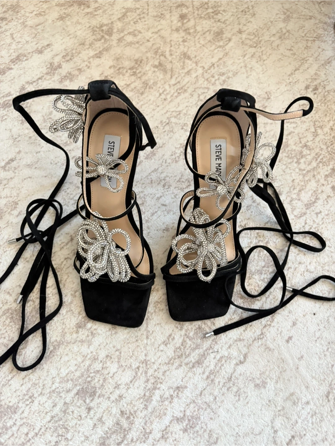Black suede heeled sandals by Steve Madden. Features sparkly floral embellishments on the straps and adjustable tie-up laces. Square toe design.