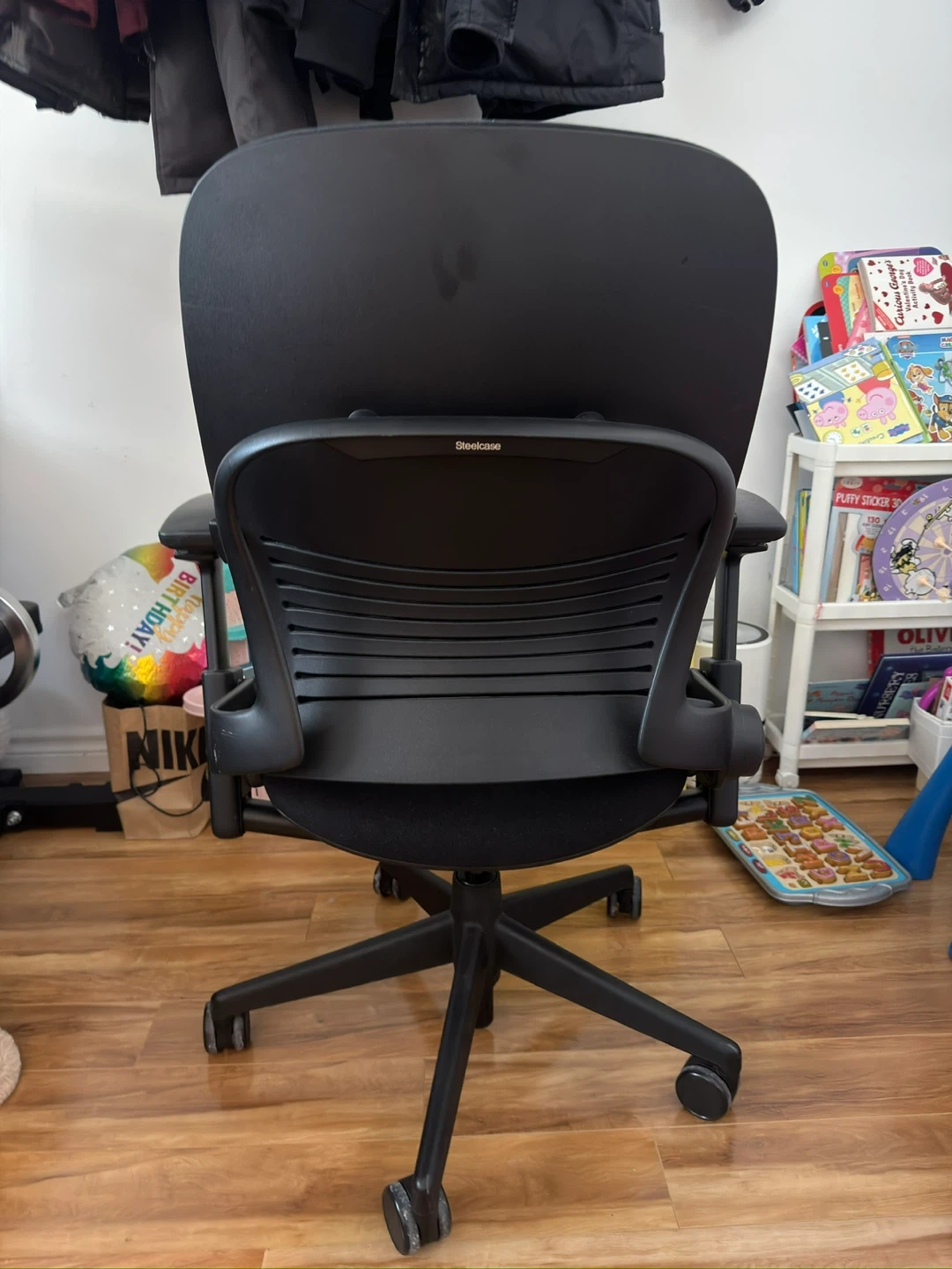This is a black Steelcase Leap office chair. It features adjustable armrests and lumbar support for comfort. Its ergonomic design makes it suitable for long hours at a desk. The chair is on wheels for easy mobility.