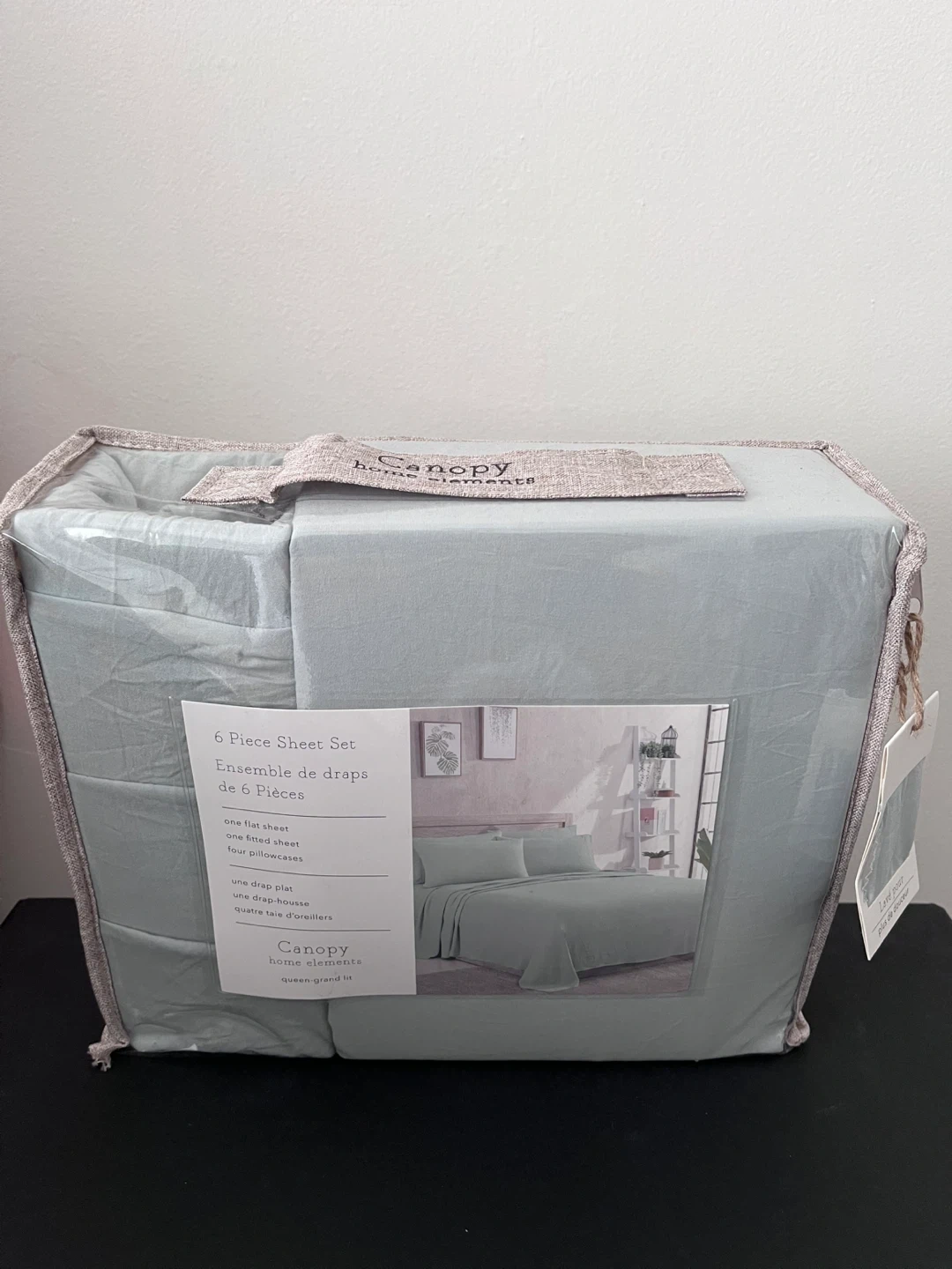 This is a 6-piece sheet set from Canopy Home Elements in a light green/blue colour. It includes one flat sheet, one fitted sheet, and four pillowcases. Made from 100% polyester, it fits up to a 14-inch mattress. Never used
