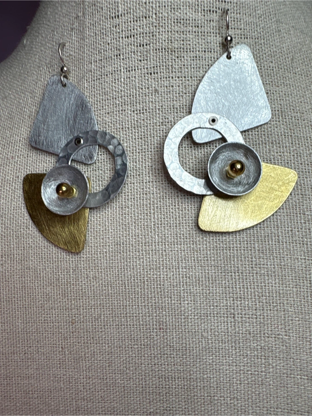 These unique artisan earrings , made by Drift Avant Gard, from their Sculpture Collection, feature a mix of brushed silver and gold-toned metals in a geometric dangle design. They have a hammered ring accent with a small brass bead detail. They're lightweight and add a statement to any outfit!