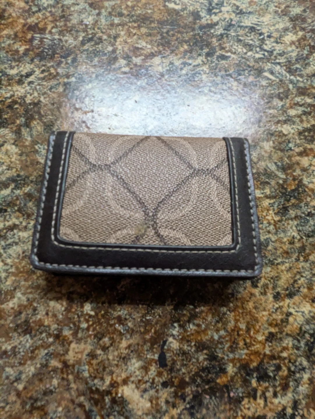 This card holder is made of brown faux leather with a patterned fabric inlay. It features a snap closure. Interior has multiple card slots.