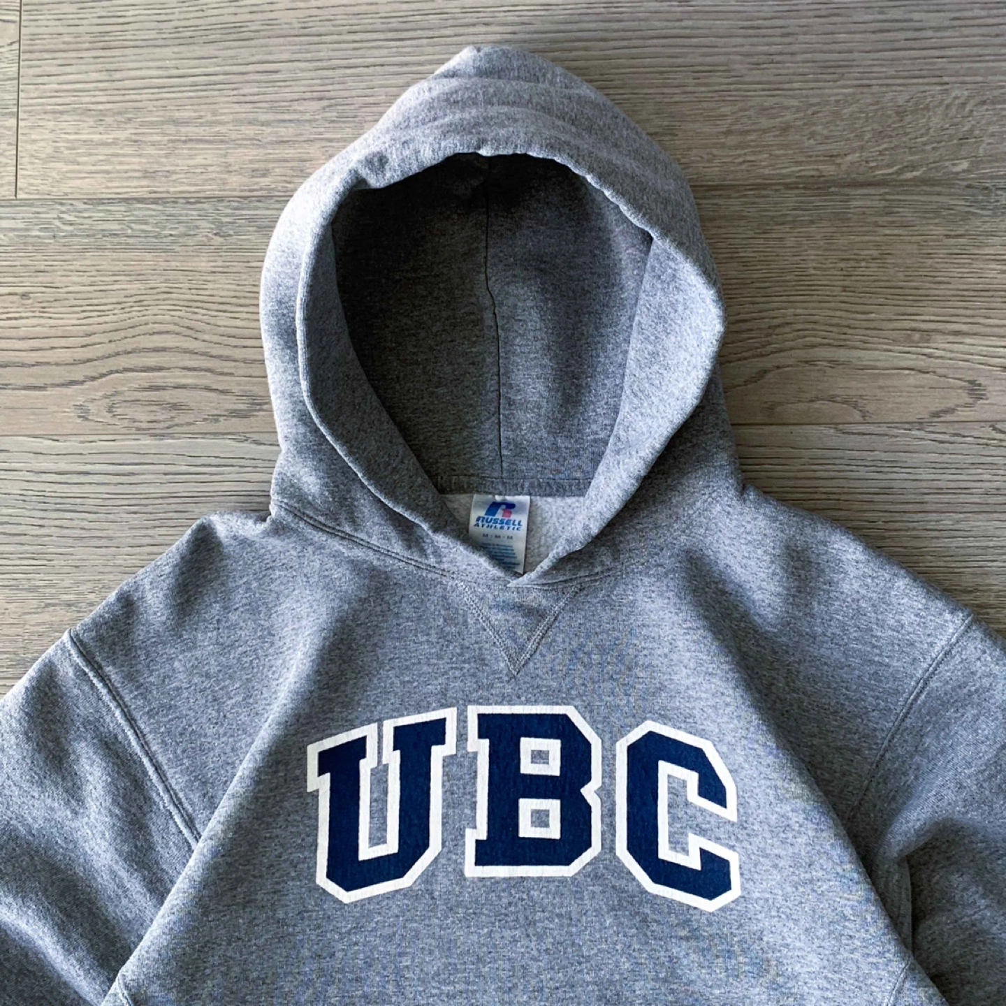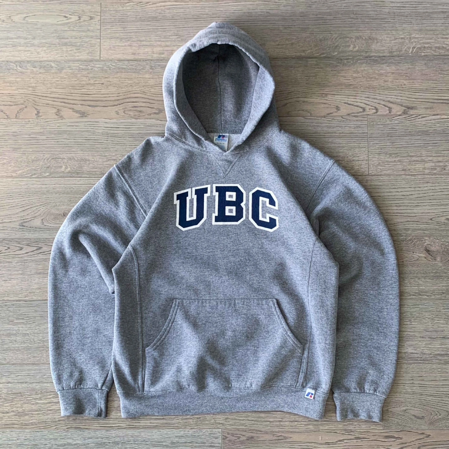 Grey Russell Athletic hoodie. Features a large UBC logo on the front. Medium size. Kangaroo pocket. Excellent condition.