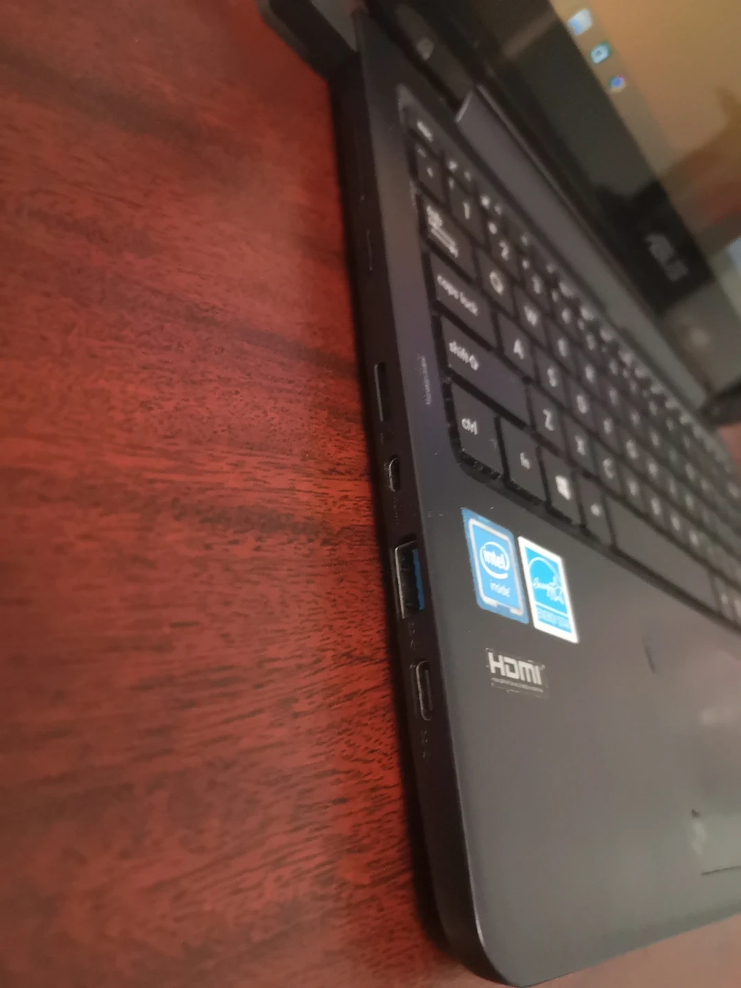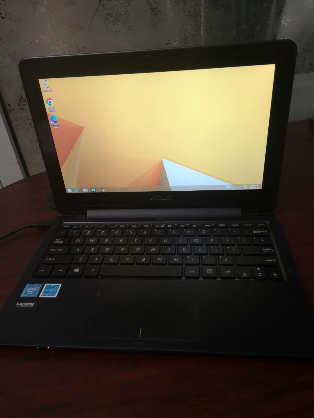 This is an ASUS laptop running Windows 8. It has an Intel processor and 29 GB of storage. Features HDMI output. Comes with an original Asus charger and mini HDMI to HDMI cable. The battery has an issue - the computer does not recognize battery so it must be plugged in all the time.