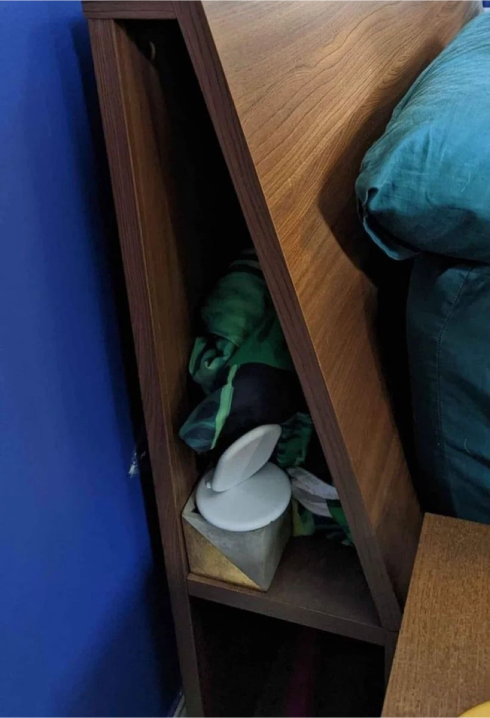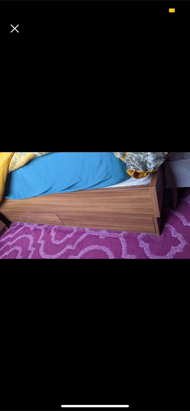 This is an IKEA OPPDAL bed frame. It's a dark wood finish. Some minor wear on the edges, as shown in photos.
