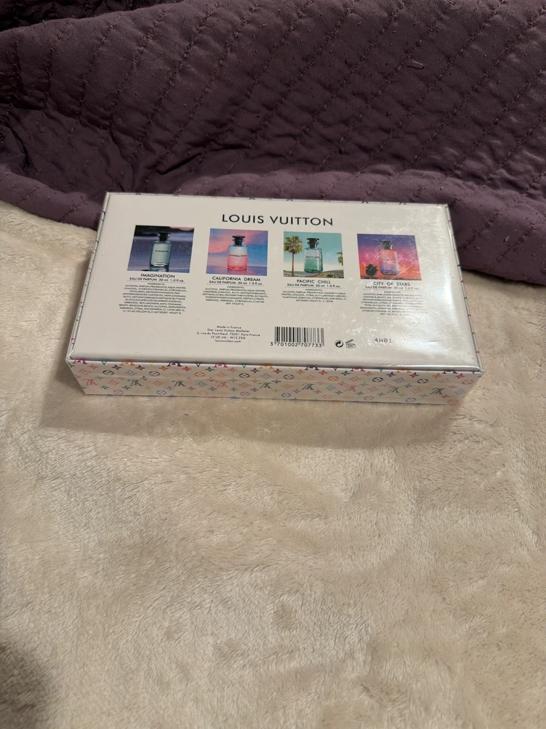This Louis Vuitton fragrance set includes four Eau de Parfum bottles. Each bottle contains 30ml of fragrance. The set features Imagination, California Dream, Pacific Chill, and City of Stars.