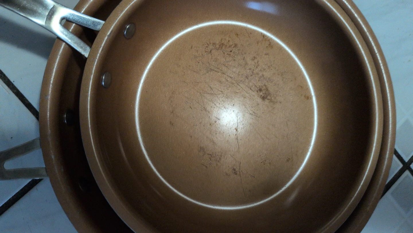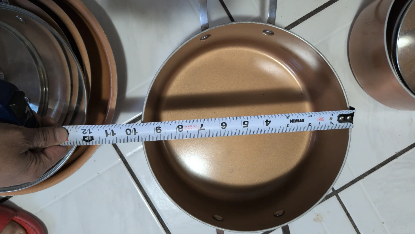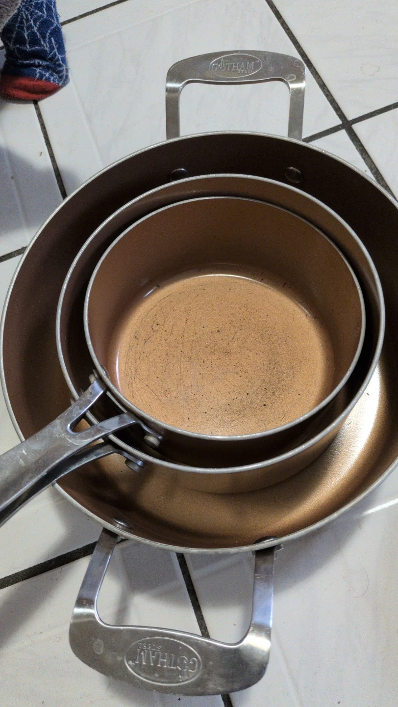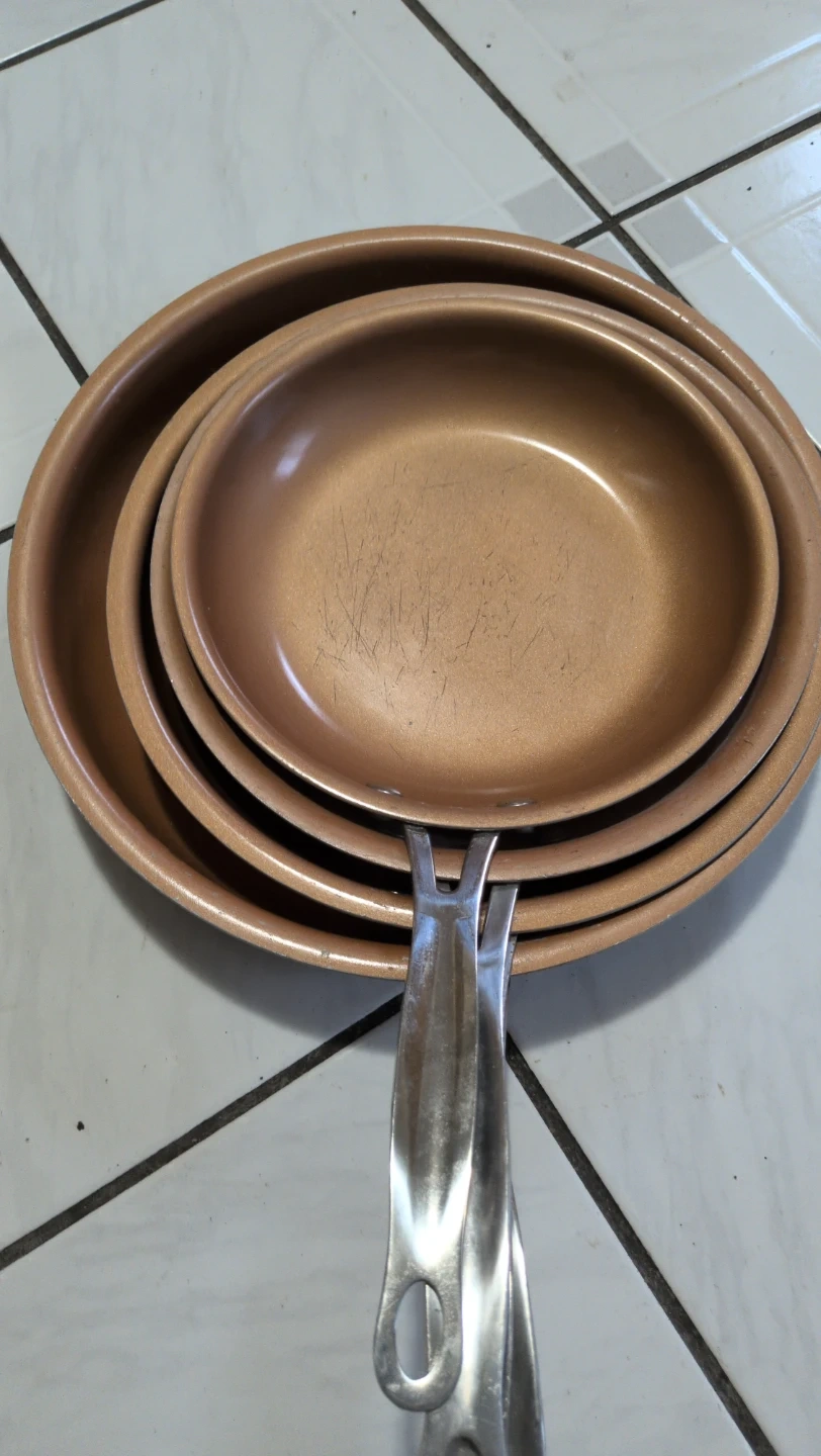 This is a set of three Gotham copper non-stick skillets. The largest skillet measures 10 inches in diameter. They're copper-coloured with stainless steel handles. Some pots and pans have been used a lot more than others but all are usable.