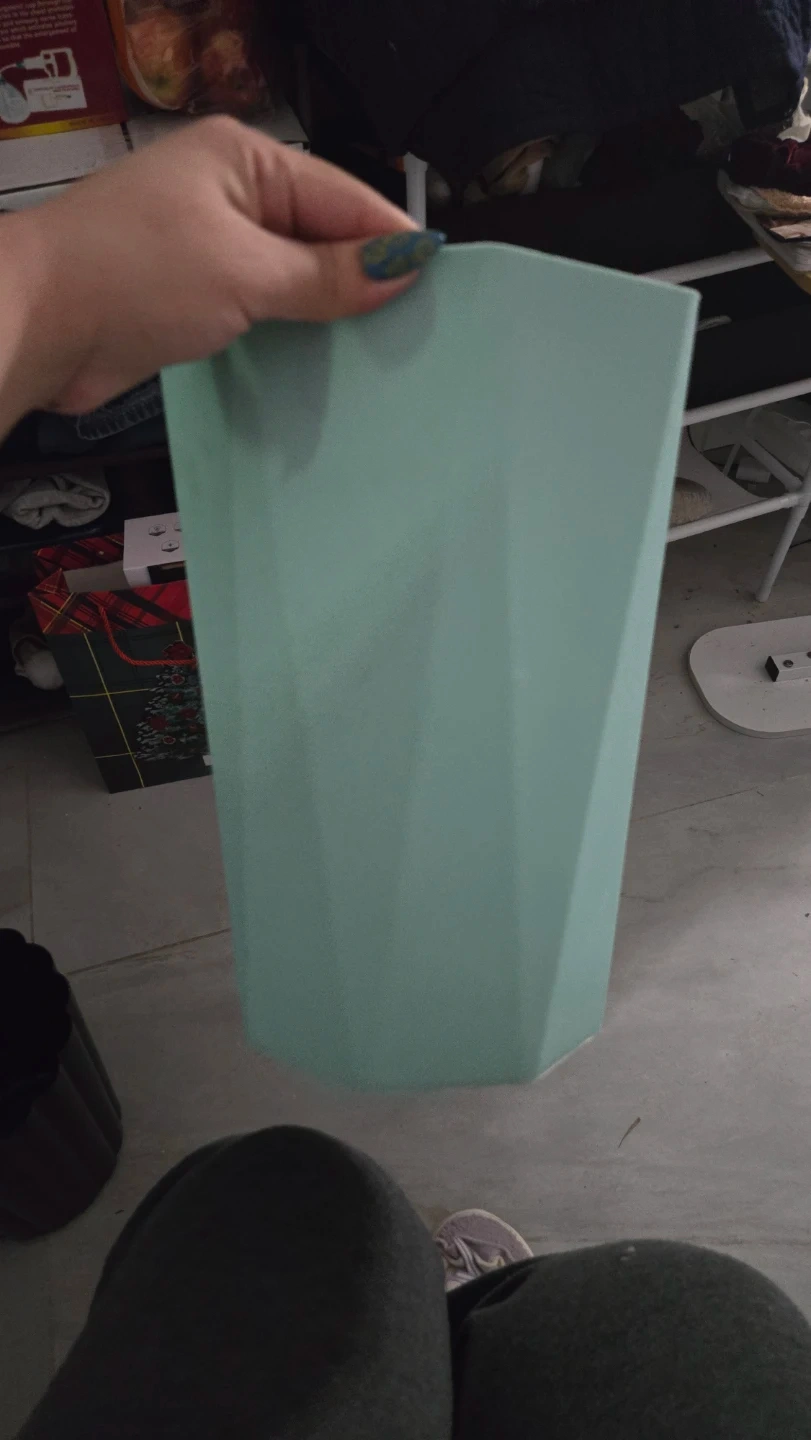Selling two trash can for bathroom or room. One is black with a scalloped edge, and the other is a light green with a geometric design. They are both in good condition