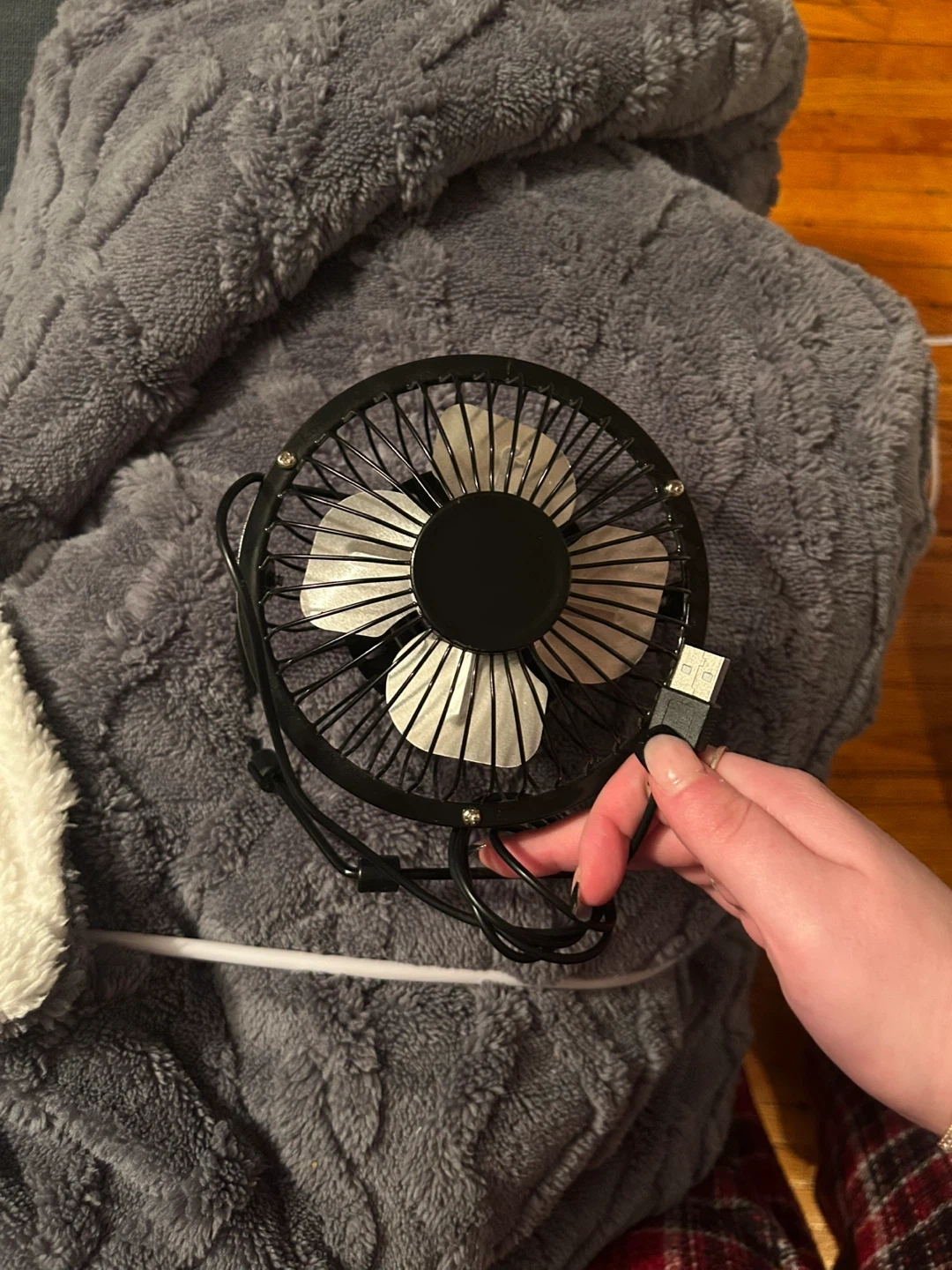 This is a portable USB desk fan. It's black with white fan blades. The fan comes with a USB power cord. It's a compact size for any desk. #freecycle