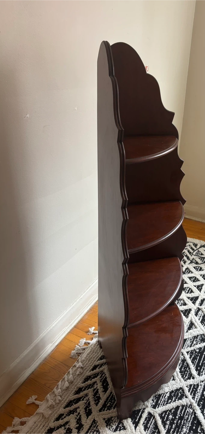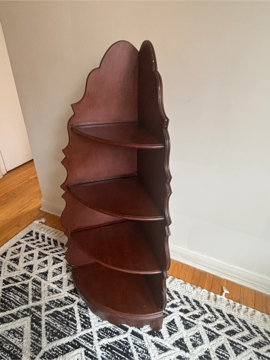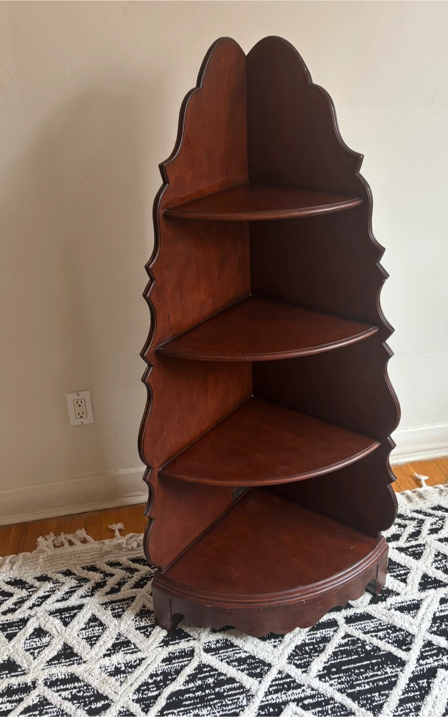 This is a dark wood corner shelf unit with four tiers. It's a great way to display items or store books. The scalloped edges add a decorative touch.