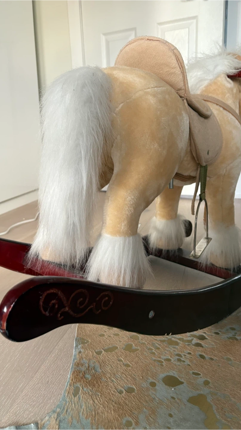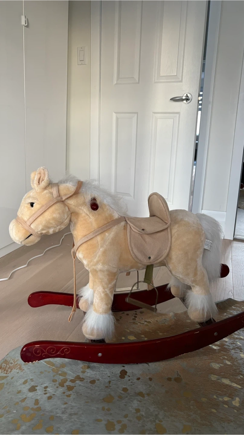 Selling a rocking horse in good condition! It's a charming addition to any playroom or nursery. The horse is beige and features a saddle and stirrups for added fun. The rocking base is a dark red colour with decorative carvings on the side