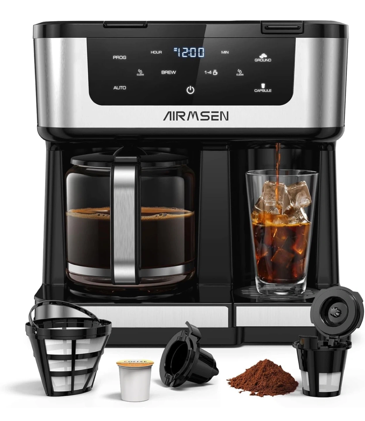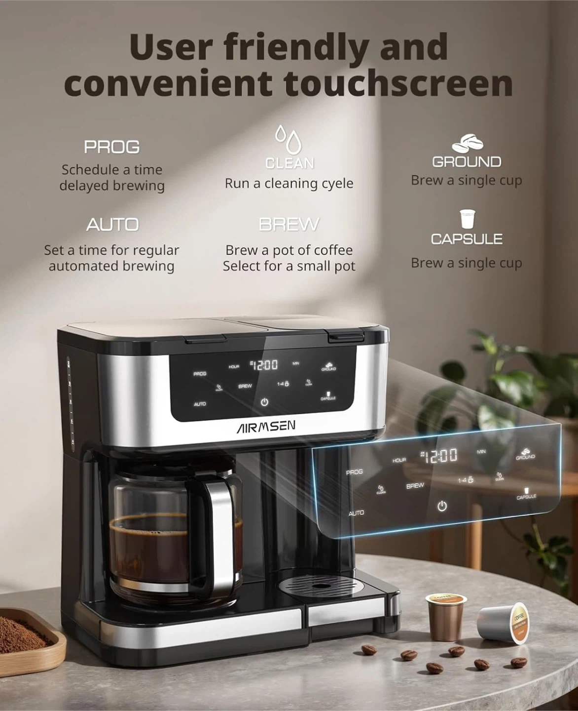 AIRMSEN Dual Coffee Maker and K Cup Combo: One cup to satisfy the whole family's preferences. Say goodbye to the era of multiple coffee machines taking up kitchen countertops! The AIRMSEN 2-in-1 coffee combo perfectly combines two of the most popular brewing methods into one stylish machine. Whether you're preparing a large pot of coffee for a family gathering or quickly making a refreshing cup for yourself, it can handle it all with ease.