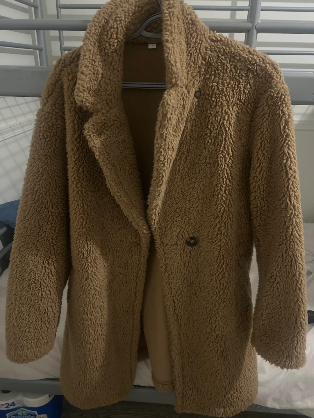 Cozy brown teddy bear fleece coat with a classic collar and button closure. It's a stylish and warm outerwear piece. Made from soft polyester material.
