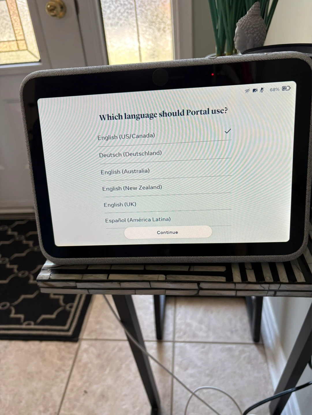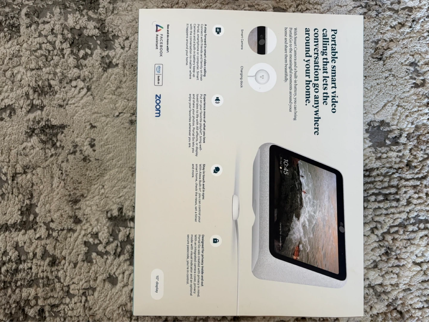 This portable smart video device lets you have video calls anywhere around your home. It features a 10" display and a rechargeable battery for convenience. It connects with Messenger and WhatsApp for easy communication.