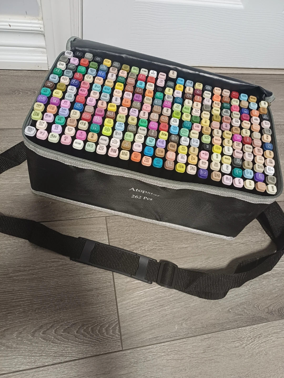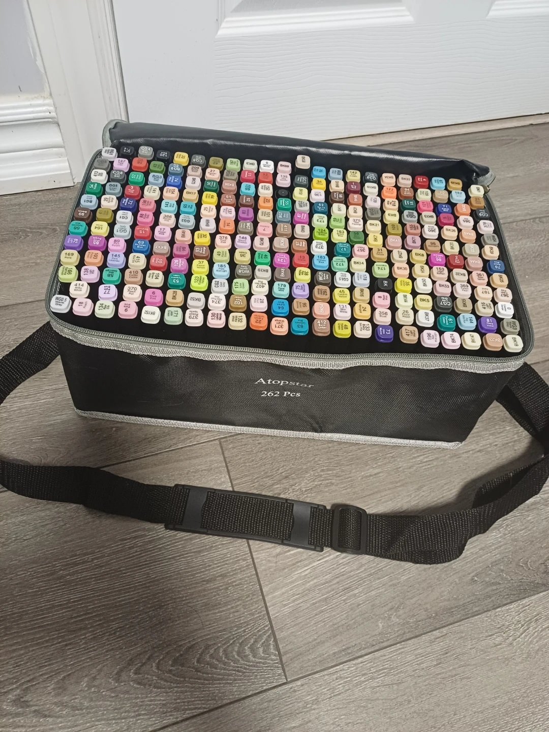 Markers are organized in a durable black carrying case with a shoulder strap. Various colours are available for your creative projects!