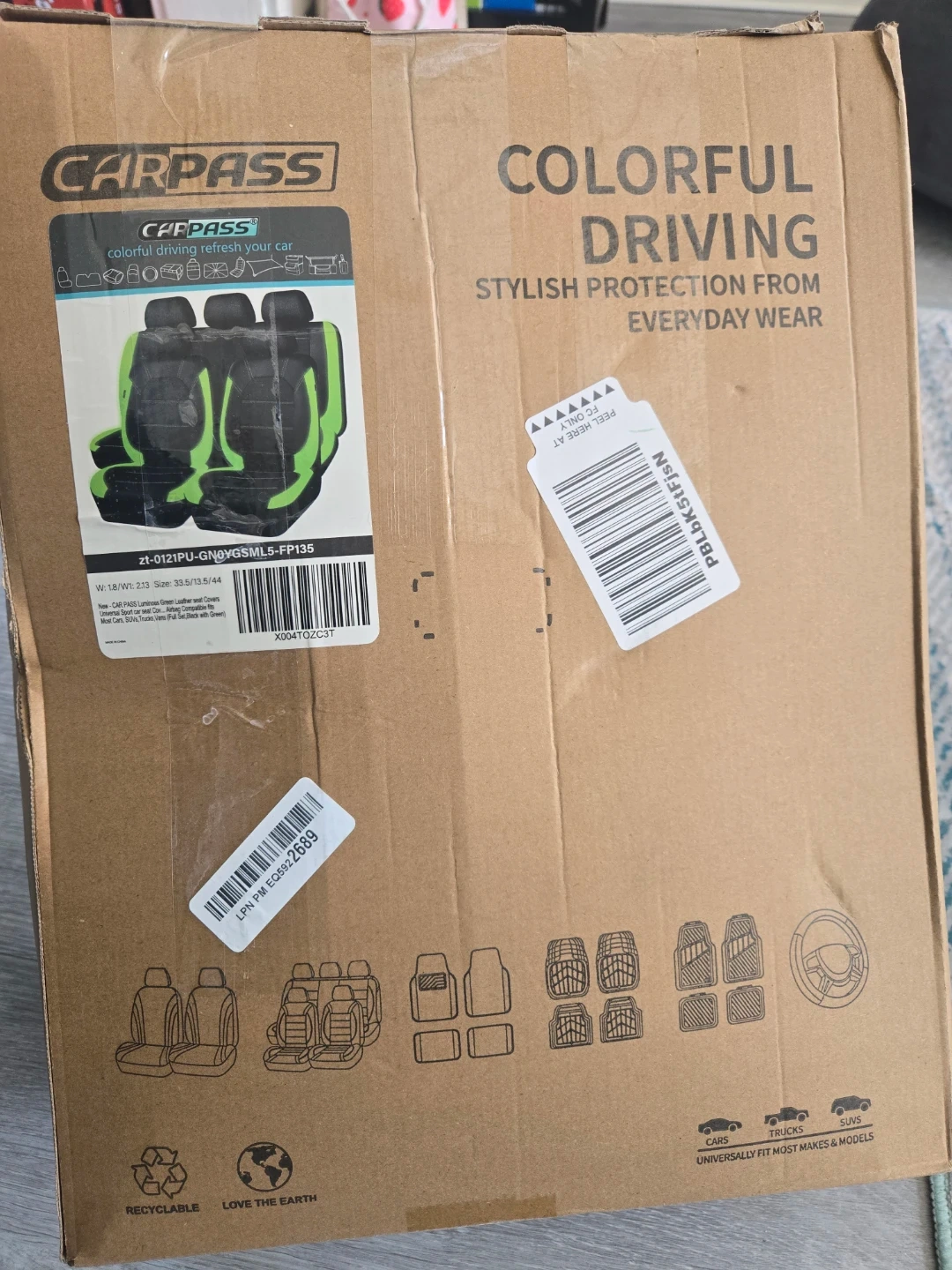 These are CARPASS Luminous Green Leather seat covers designed for cars, SUVs, and trucks. They offer stylish protection from everyday wear and are universally fit for most makes and models. The set includes front and rear seat covers and floor mats, in a black and green color scheme.