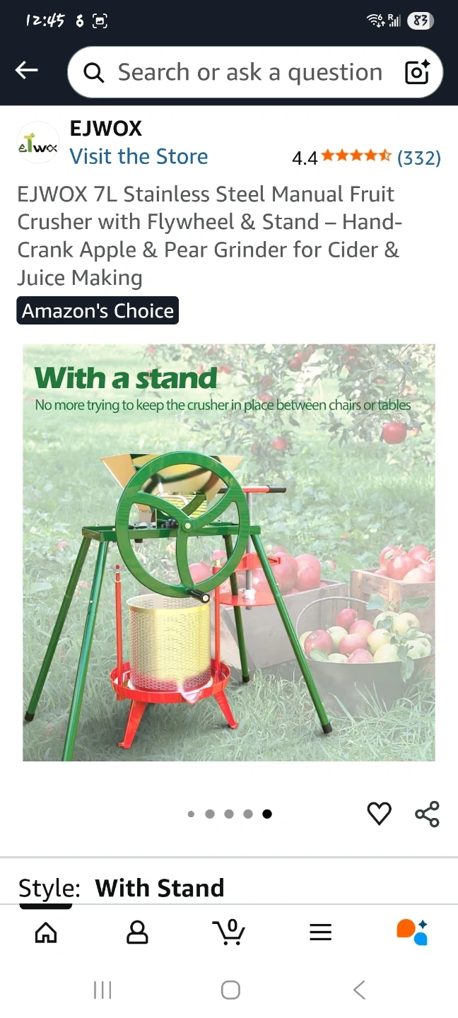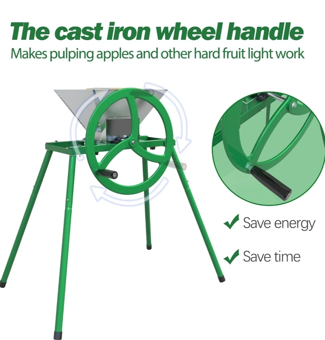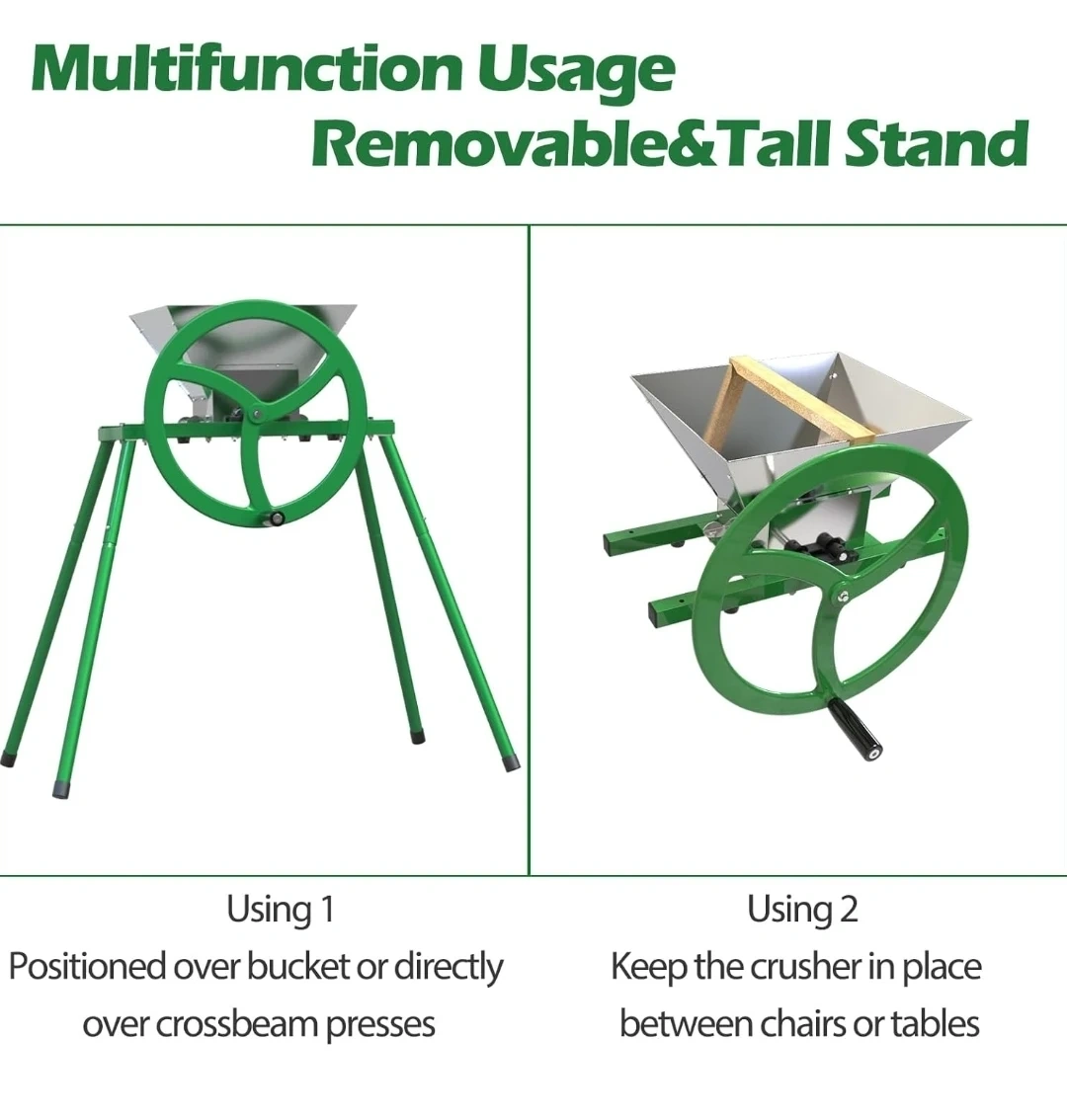 This manual fruit crusher features a stainless steel hopper and combination rollers with hooked cutting blades made of strong aluminium alloy. It has a strong steel frame and legs with a cast iron wheel handle for easy operation. It's great for pulping apples and other hard fruits for cider and juice making.