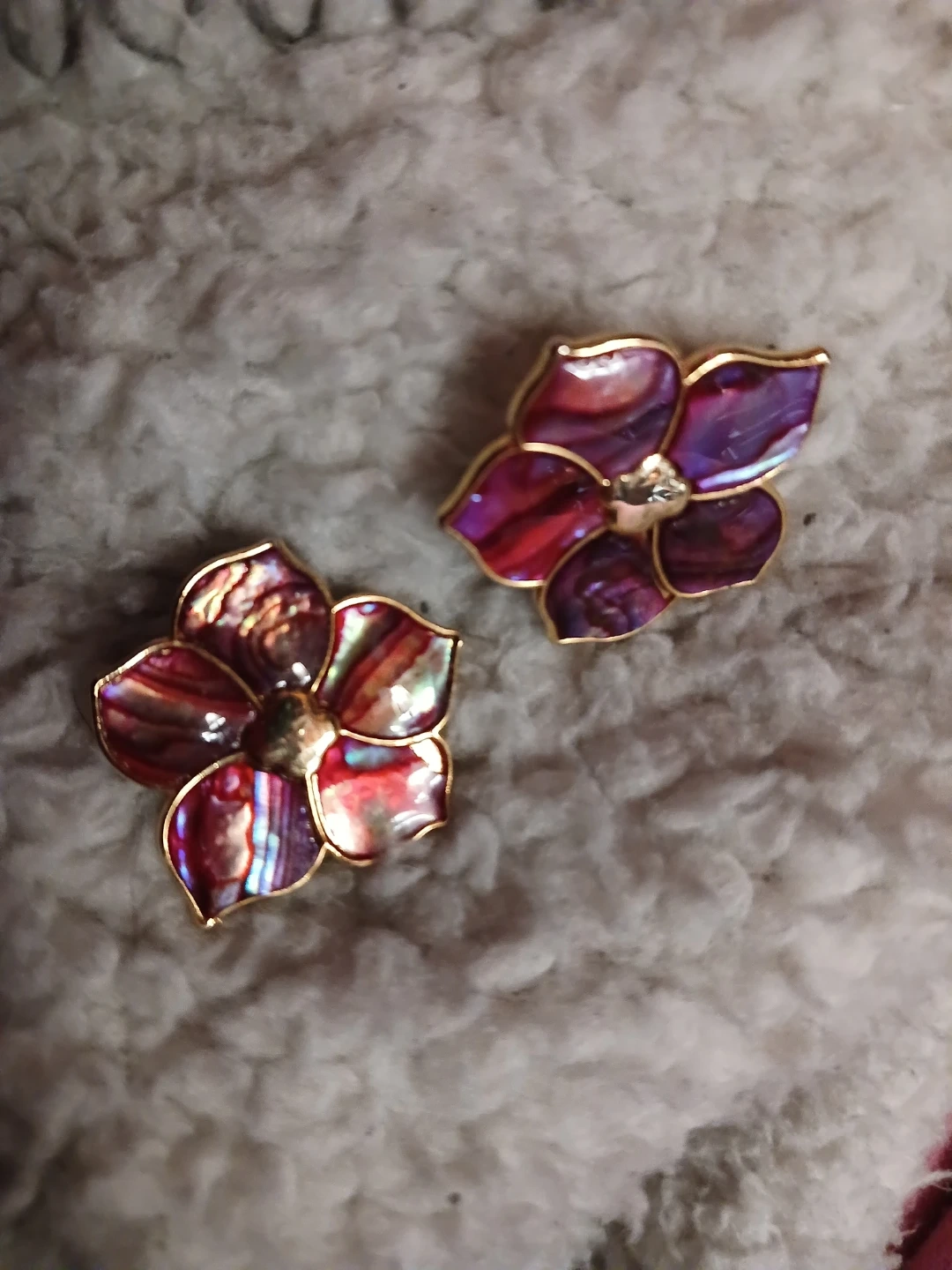 A pair of flower-shaped brooches with iridescent shell inlay. The brooches have a gold-tone metal trim and a small gem in the centre. They feature beautiful shades of purple and red. *there is a small piece missing in the corner of one of the earrings*