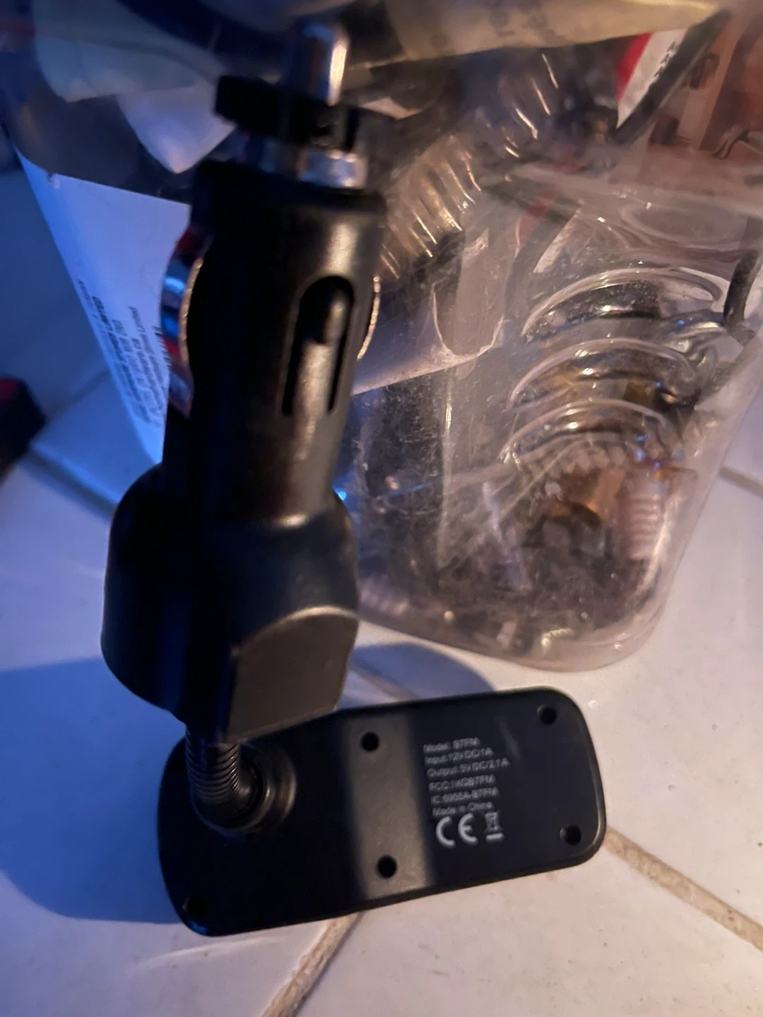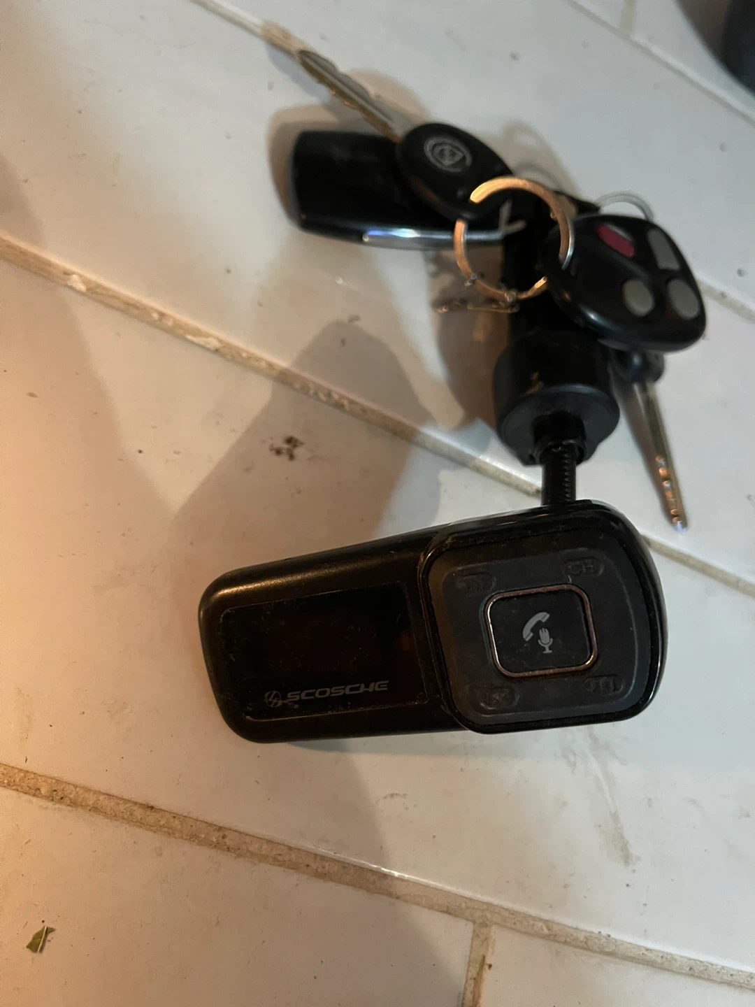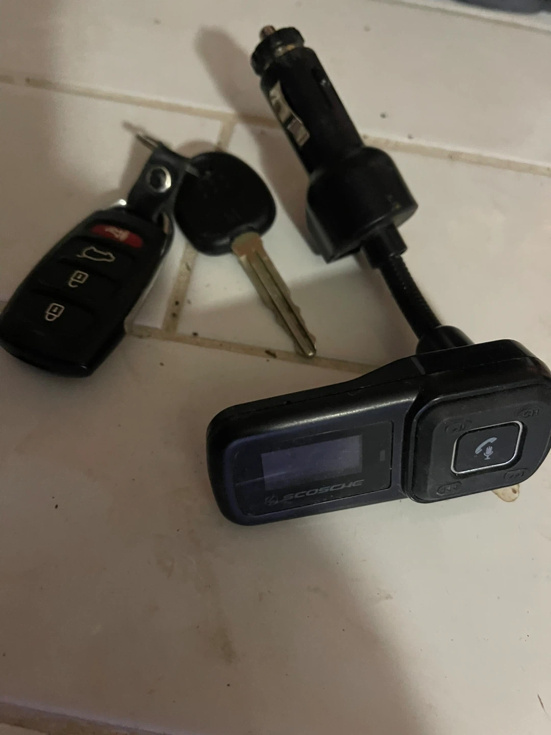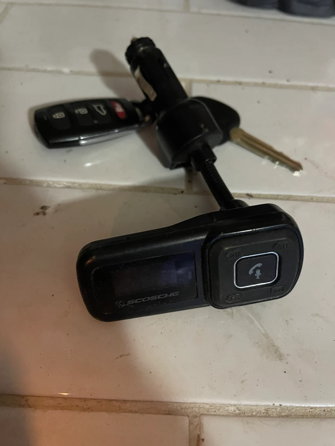 This Scosche FM transmitter is a handy car charger that lets you stream music from your phone. It plugs into your car's cigarette lighter for power. Its compact design makes it easy to use in any vehicle.