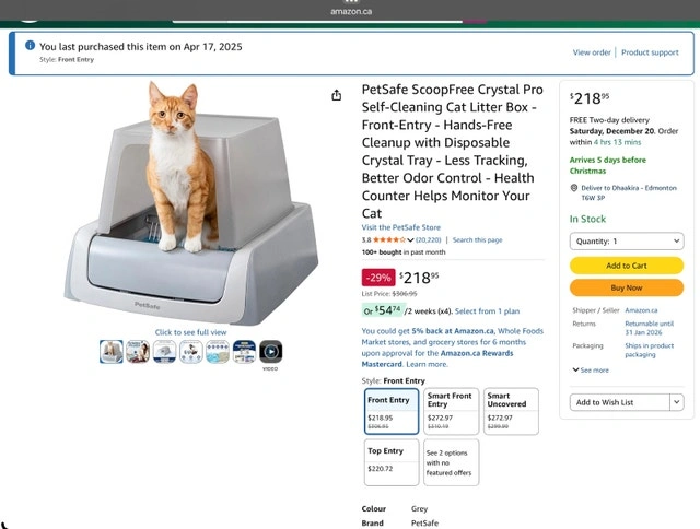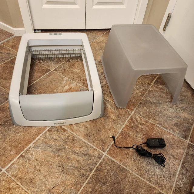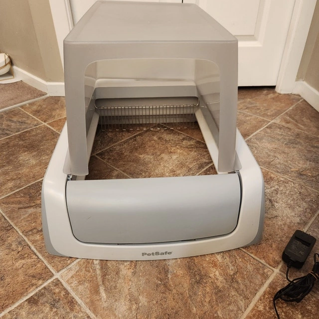 PetSafe Self Cleaning Cat Litter Box with Hood and Front Entry. Hands-free clean up. Power adapter included. Disposable litter tray NOT included. Used - Good Condition. Small chip at the base of the cover (see photos), but it doesn't affect function. Original price was over $307+GST. Selling for $120. Price is firm and non-negotiable. Cash only. Pick up in Allard, SW Edmonton. Curbside pickup available.