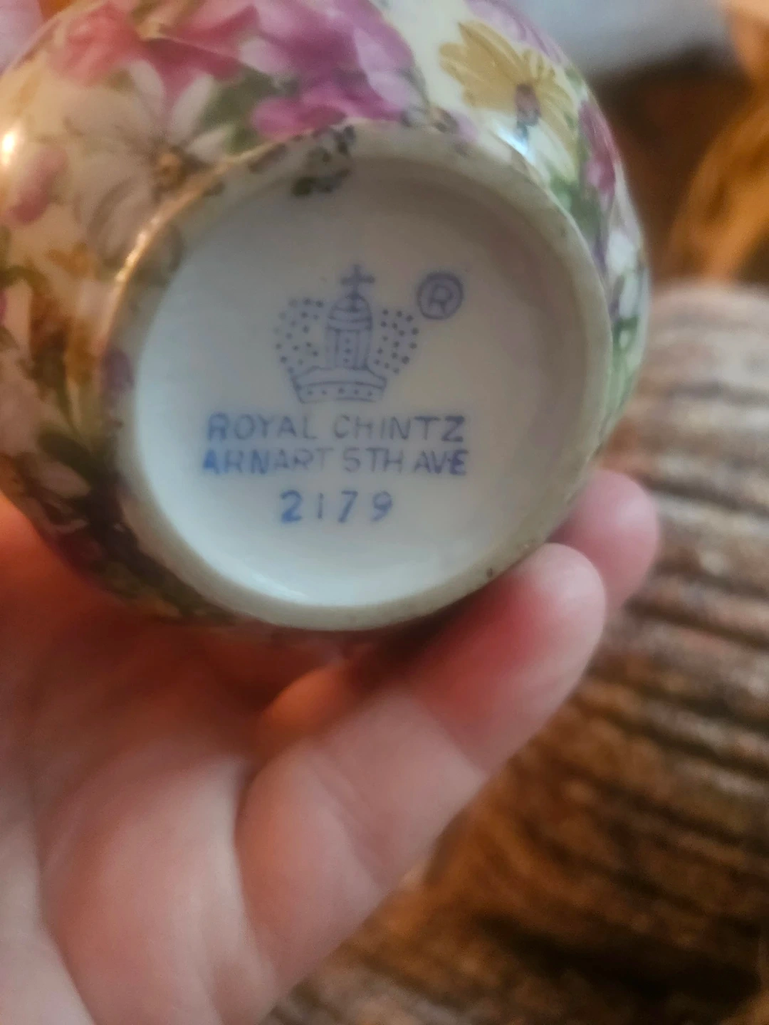 This is a vintage Royal Chintz creamer pitcher with a floral pattern. It's made of porcelain and features a gold ,and collectible figurine.