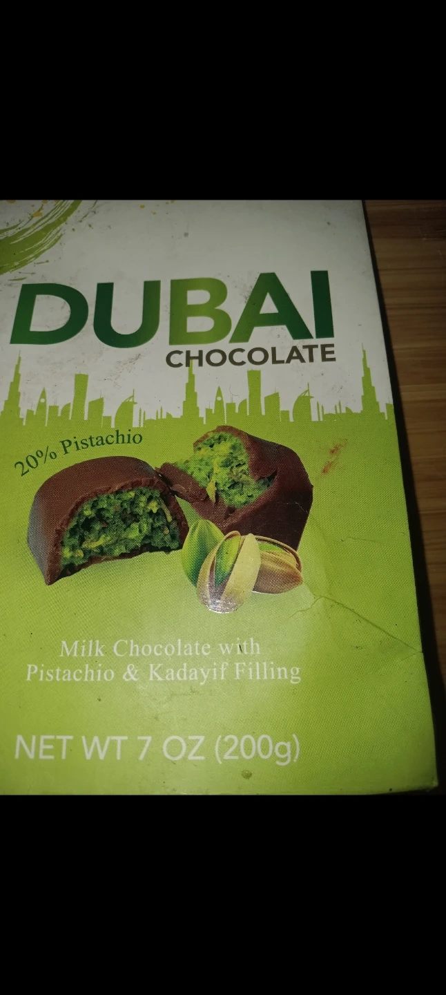This is a box of Dubai Chocolate with milk chocolate and pistachio & kadayif filling. It contains 20% pistachio. Net weight is 7 oz (200g).