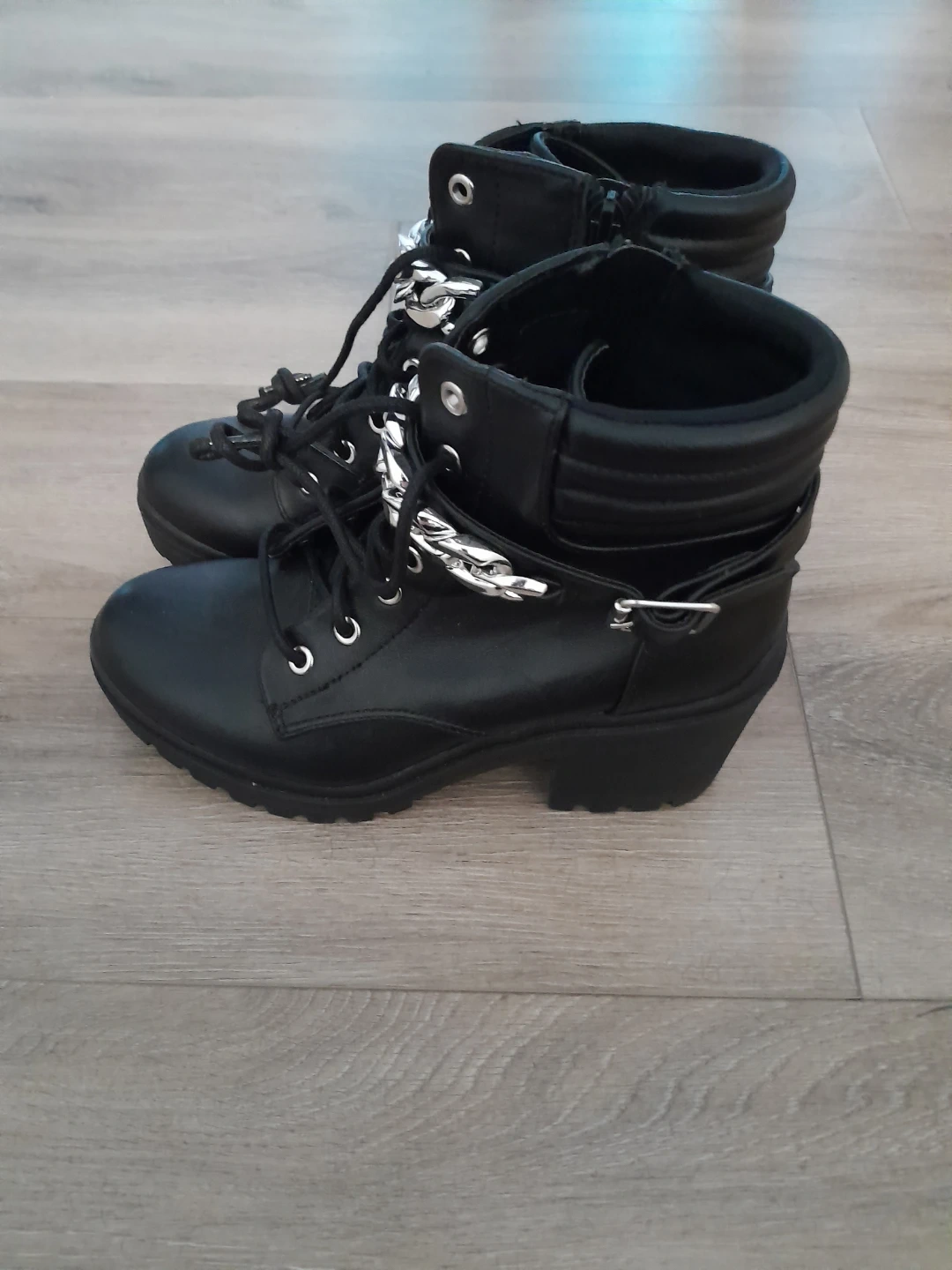 These black ankle boots feature a stylish chain detail. They're in great shape and ready for a new owner. Perfect for adding a bit of edge to any outfit!