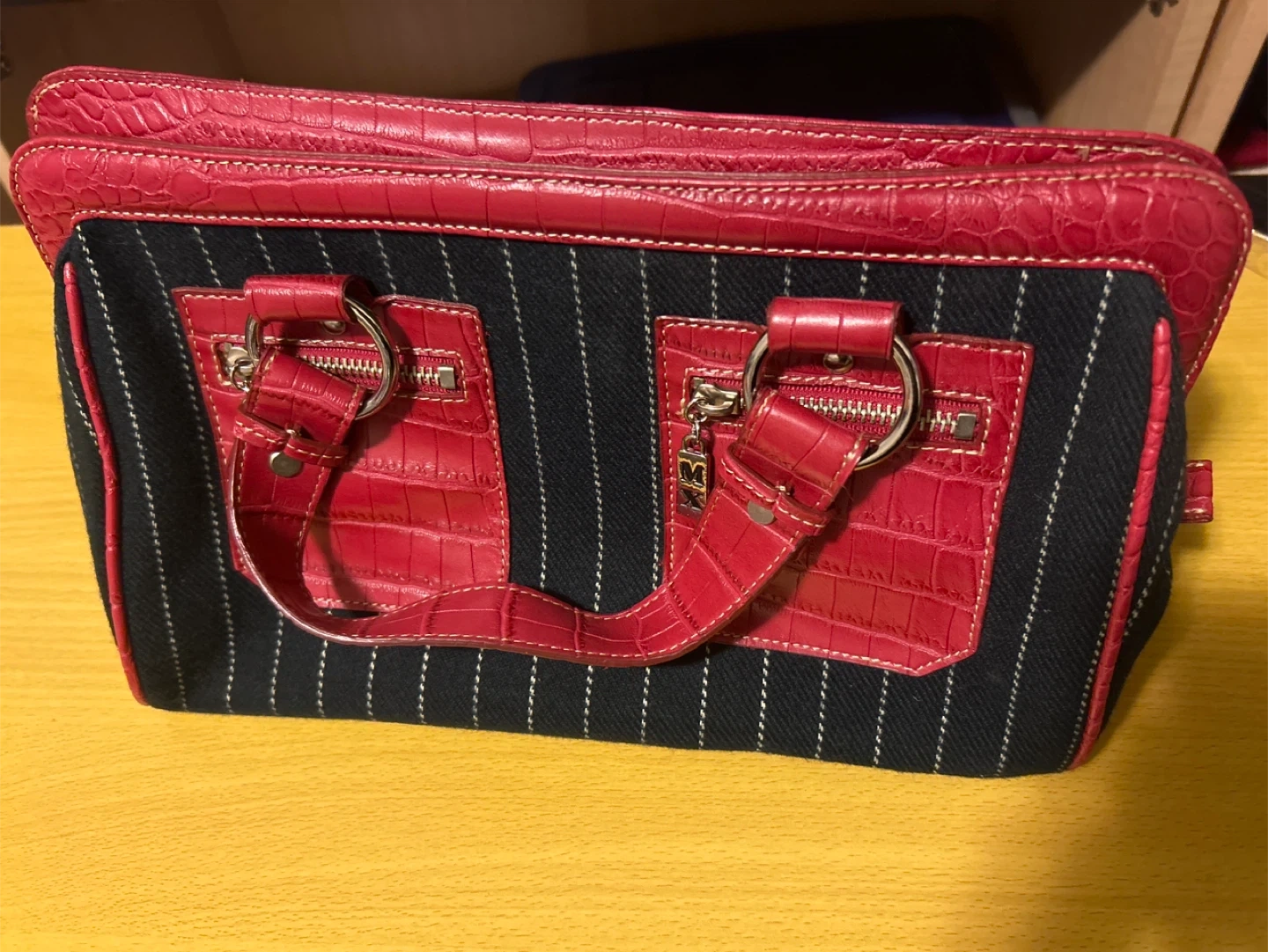 This stylish satchel handbag features a classic pinstripe design. It has red faux crocodile trim and silver-tone hardware. Zipper closure for security.