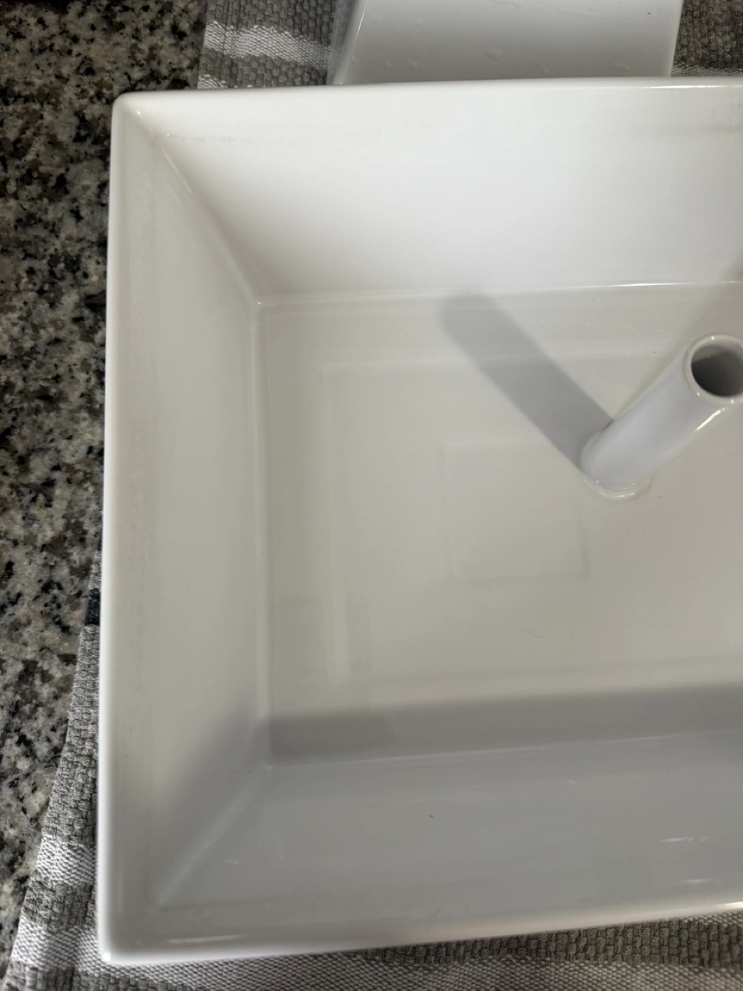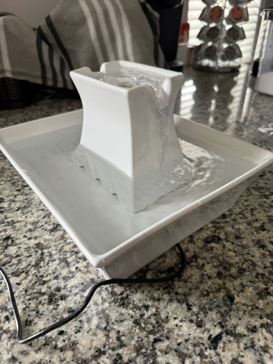 Still in good condition, some faint carbon stains from use with the carbon filter over time. The fountain is not completely silent, it has some faint water noises, but our cats were fine with that and drank from it!