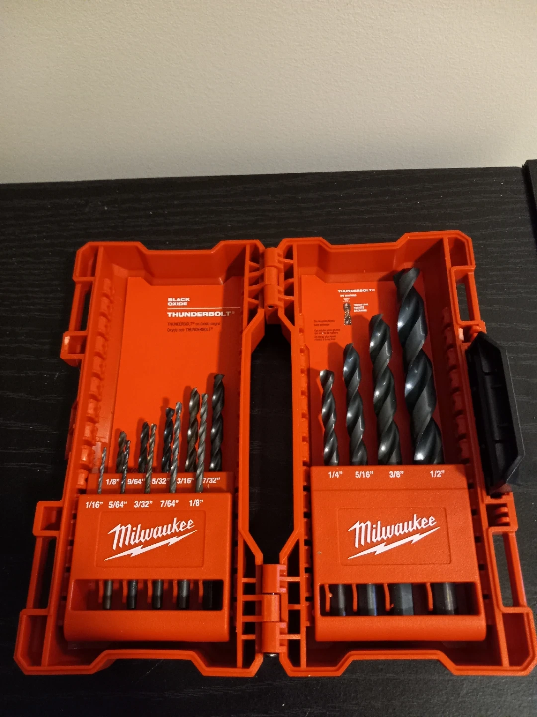 This Milwaukee drill bit set features black oxide coating for durability. It includes various sizes from 1/16" to 1/2" and 1/4" to 1/2". Thunderbolt technology.
