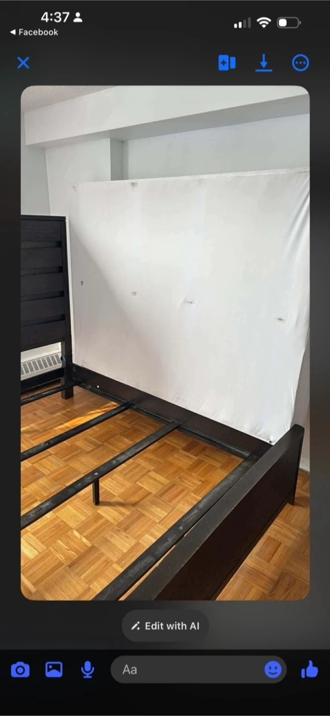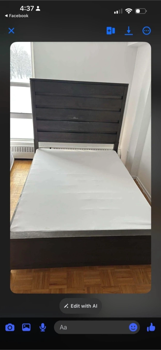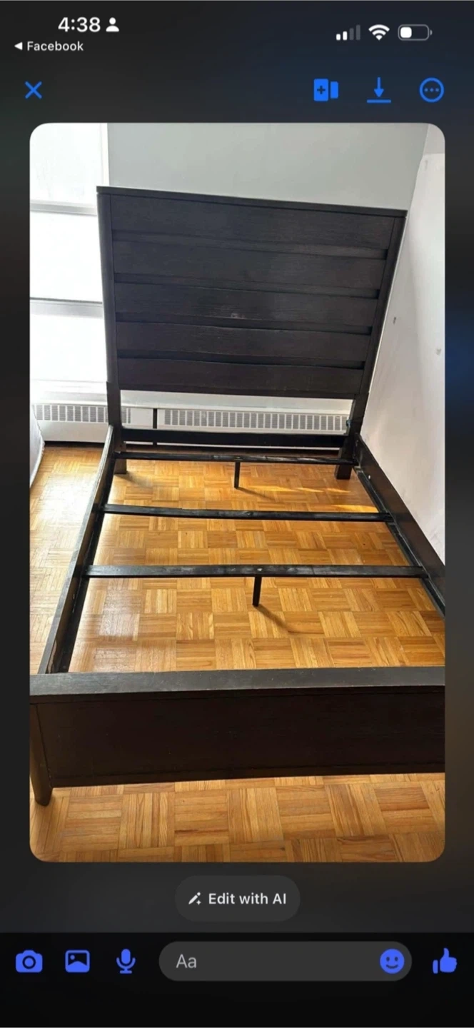 This is a dark wood queen-sized bed frame. It features a modern slatted headboard design. Some wear and tear is visible on the footboard.