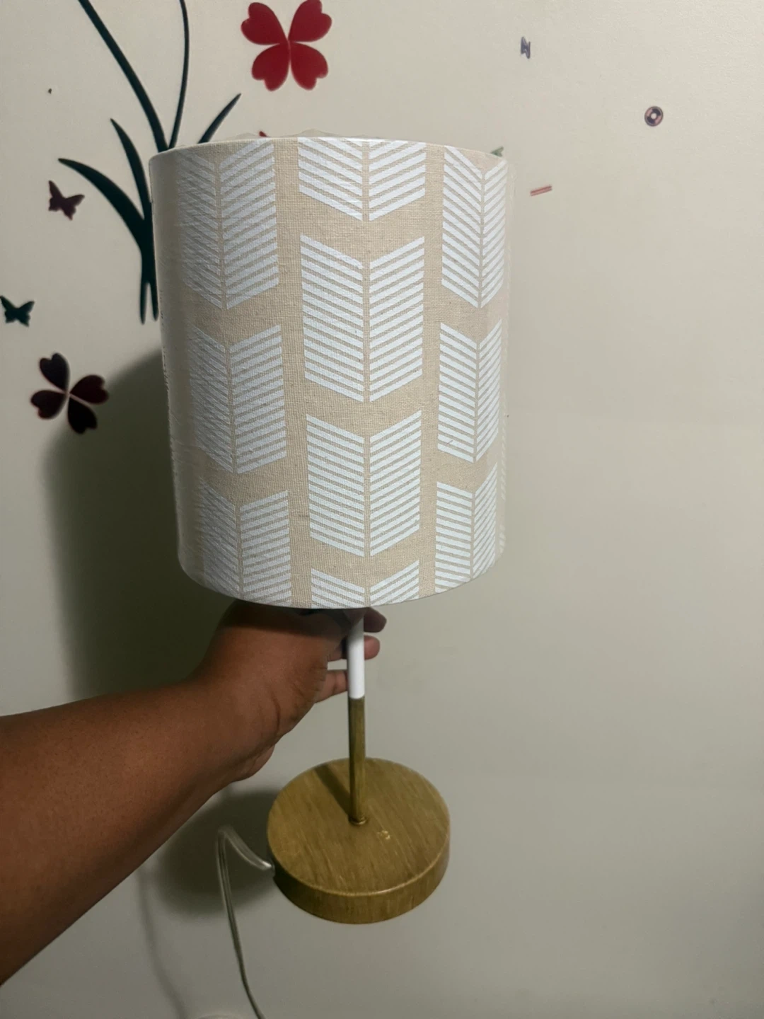 Here's a cute table lamp with a patterned shade! It has a wooden base and would look great in any room. The shade features a stylish design, adding a touch of personality to your space