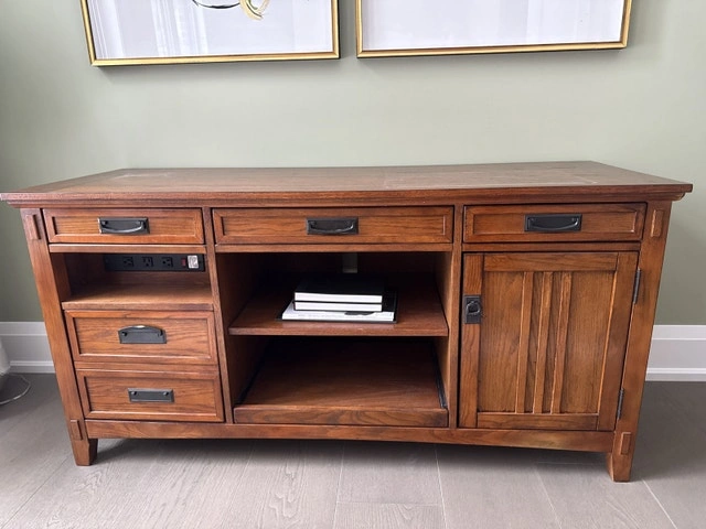 This is a used, but well-maintained solid wood media console that offers both style and functionality for your entertainment setup. The console features a warm, rich finish and ample storage options, including drawers, shelves, and a cabinet. Table shelves are available.