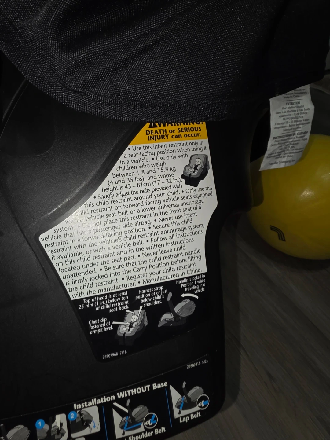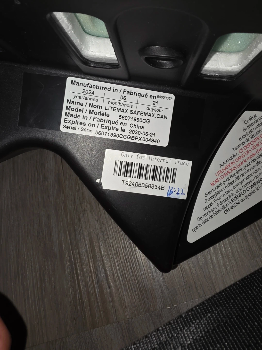 This Evenflo LITEMAX infant car seat is designed for children 4-35 lbs. It has a manufactured date of June 2024 and expires on June 21, 2030. The car seat includes the base for easy installation.