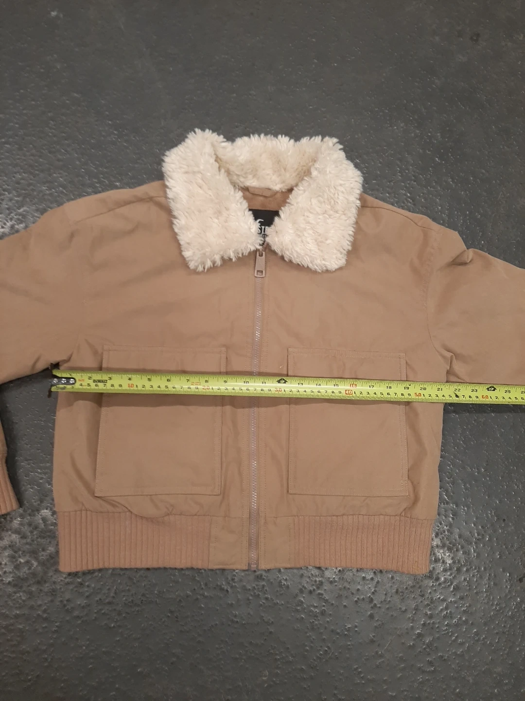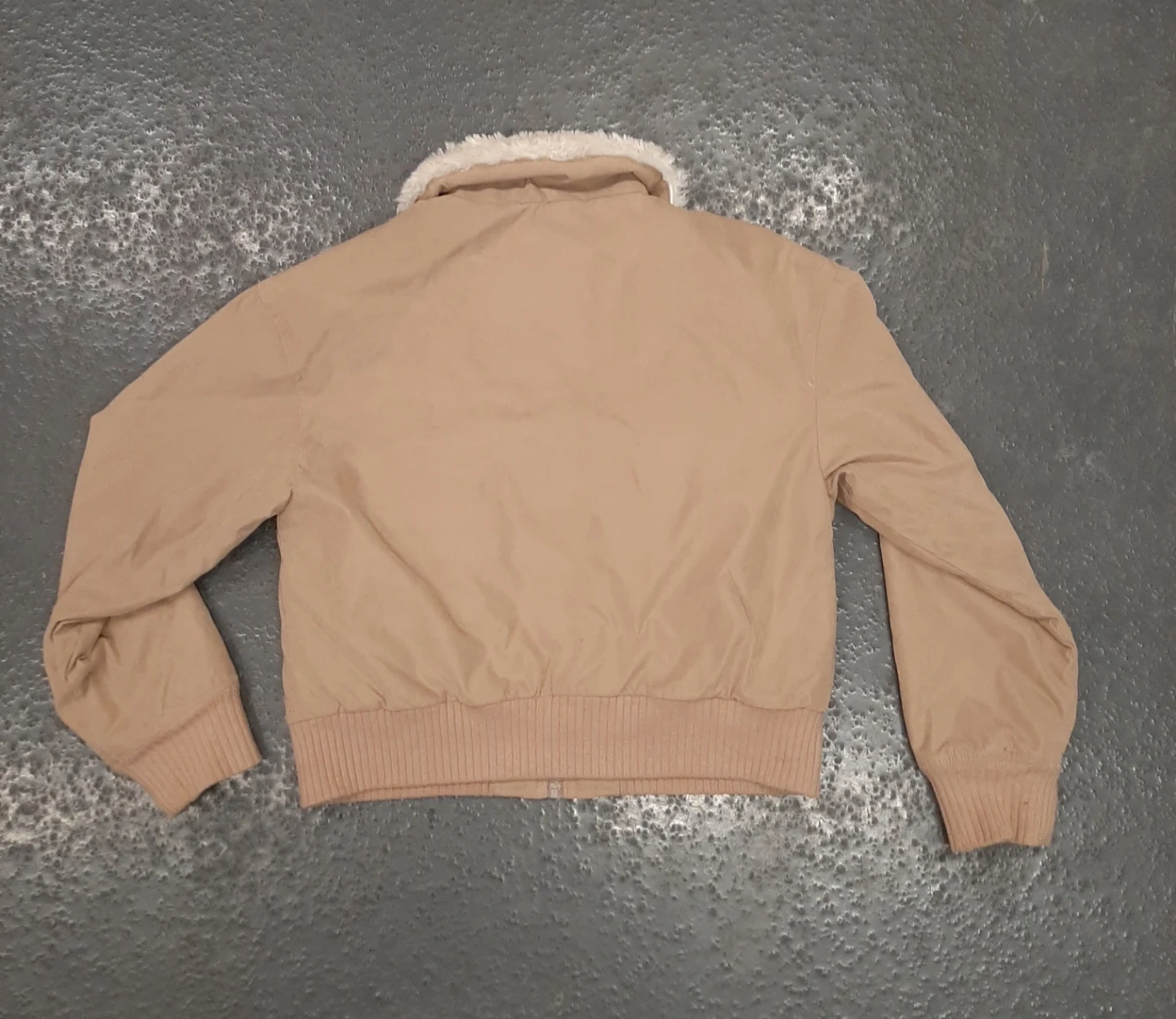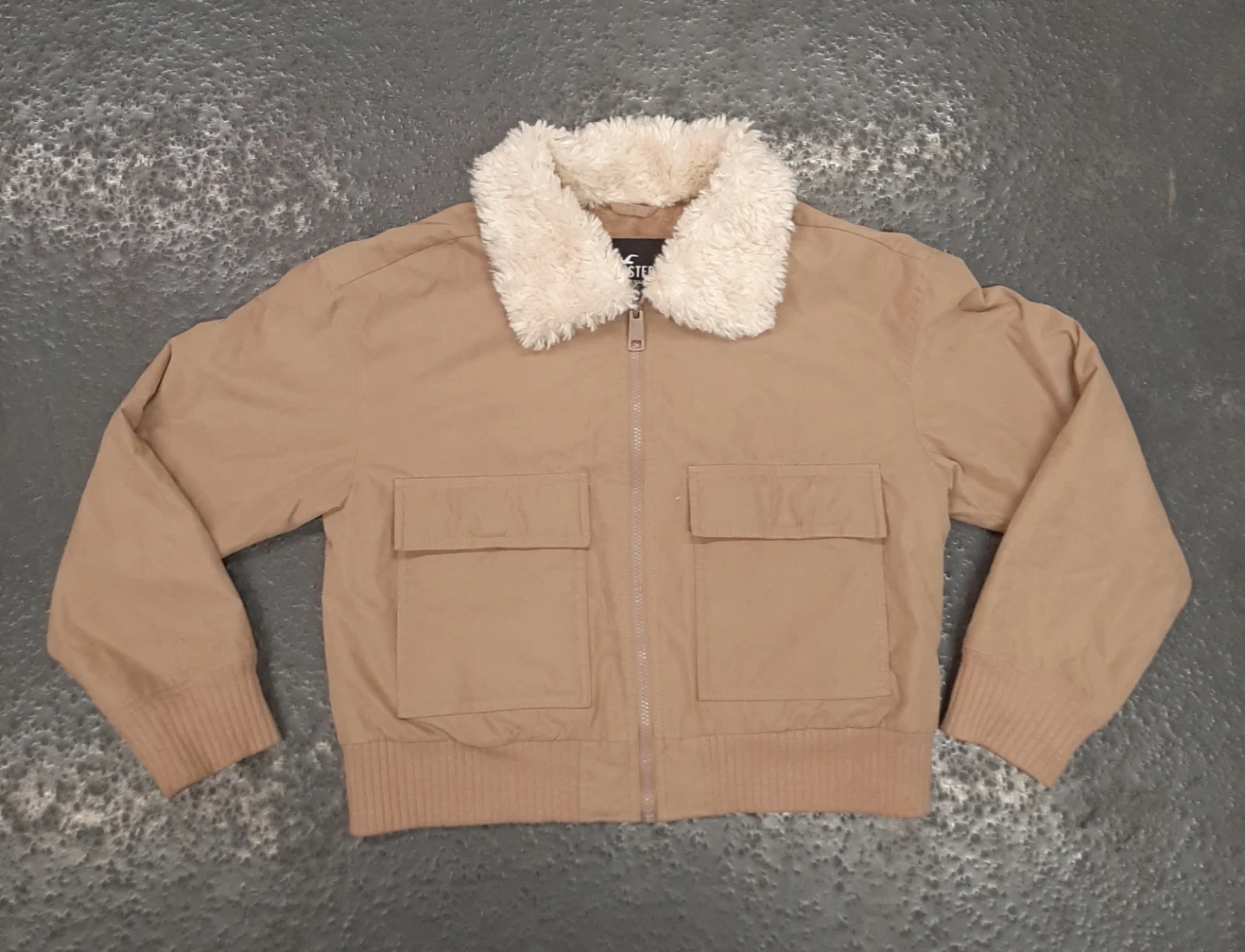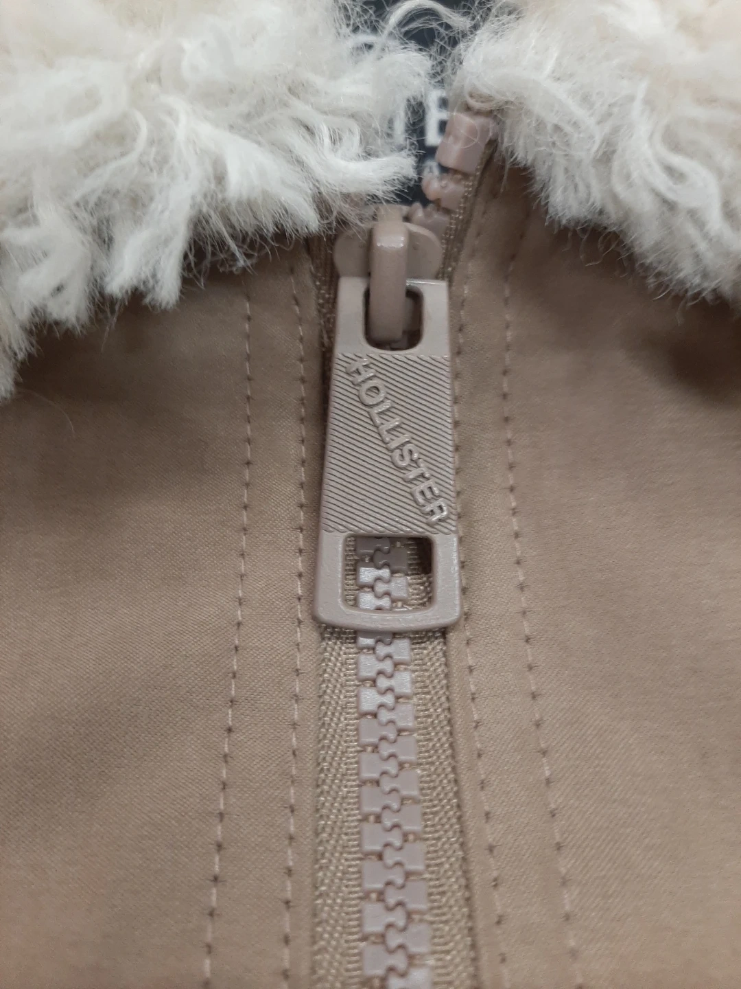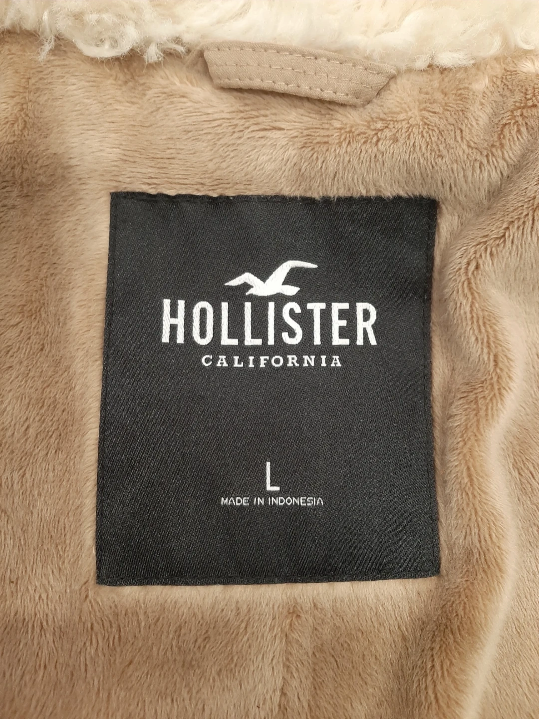 Selling a Hollister jacket in size large. It's a tan colour with a fuzzy collar and lining. It has pockets on the front and a zipper closure