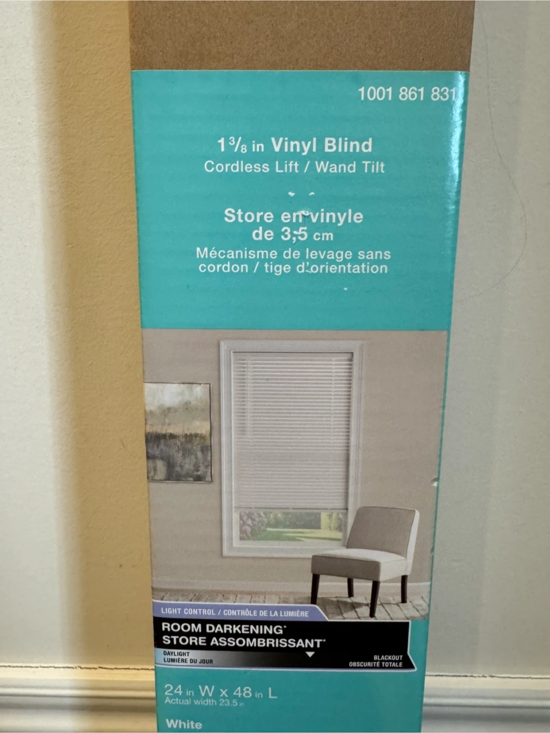 This is a 1 3/8 inch vinyl blind with cordless lift and wand tilt. It's white and measures 24 inches wide by 48 inches long. This room darkening blind offers total obscurity.