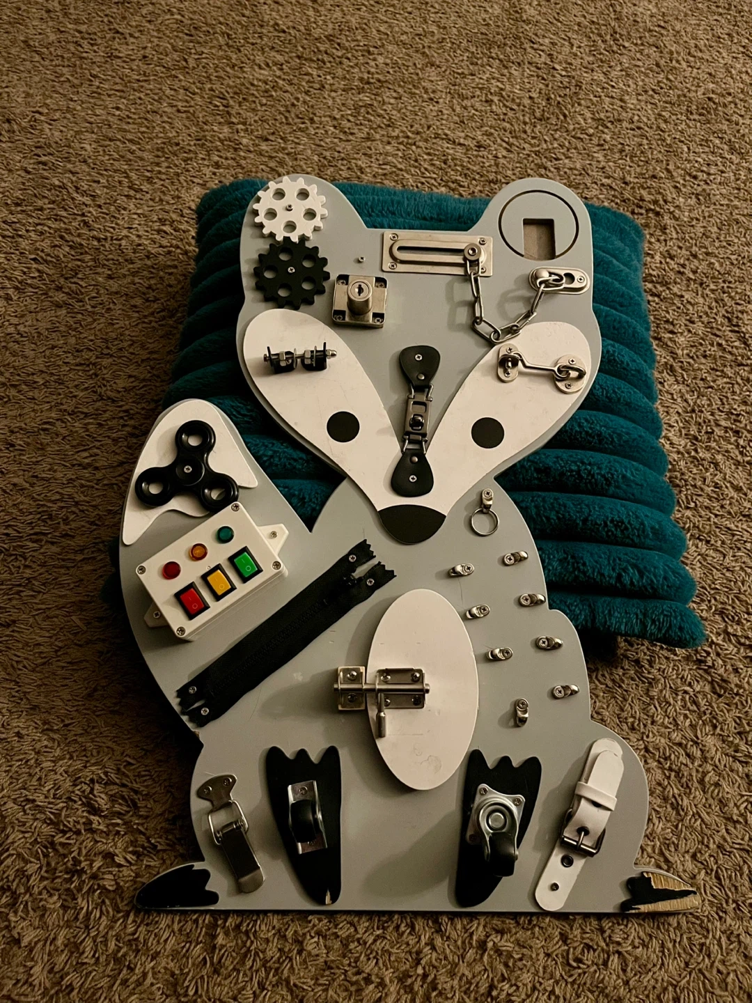 This busy board is designed in a cute raccoon shape and features various latches, locks, zippers, gears, and a spinner. It's great for developing fine motor skills and hand-eye coordination. It offers a variety of activities to keep little ones engaged and learning!
