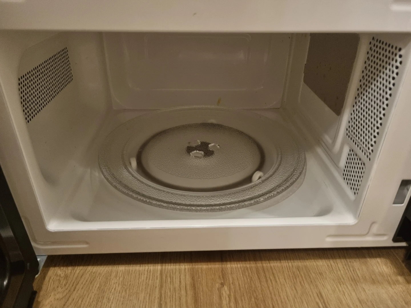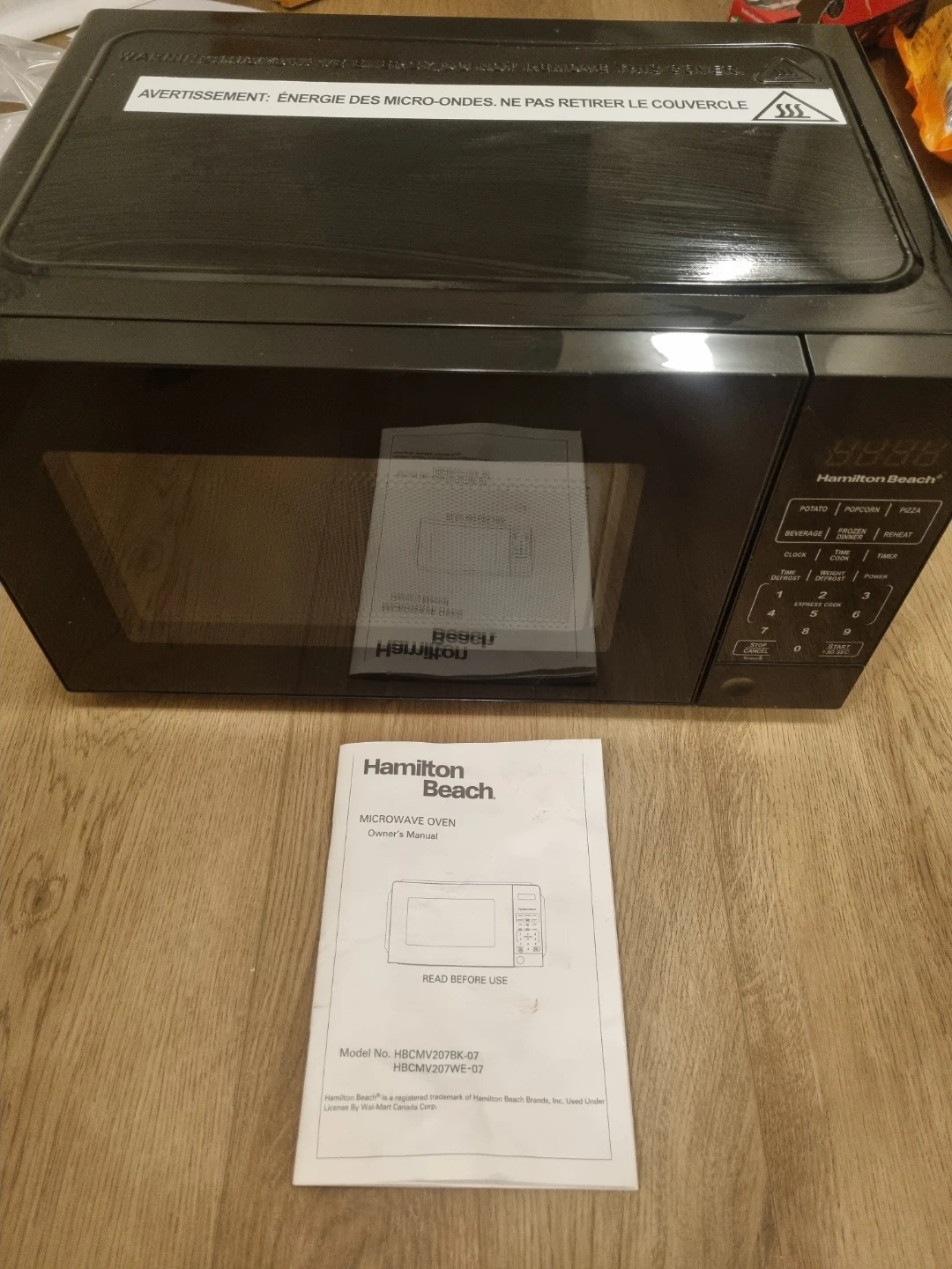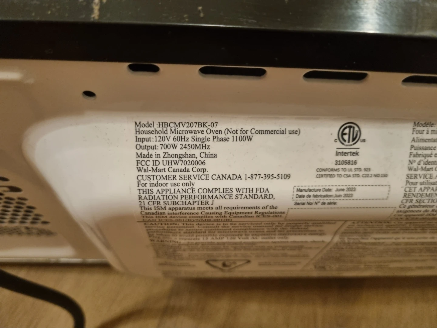 This is a Hamilton Beach household microwave oven. It's a 700W model with a 120V input and 60Hz frequency. Manufactured in June 2023.