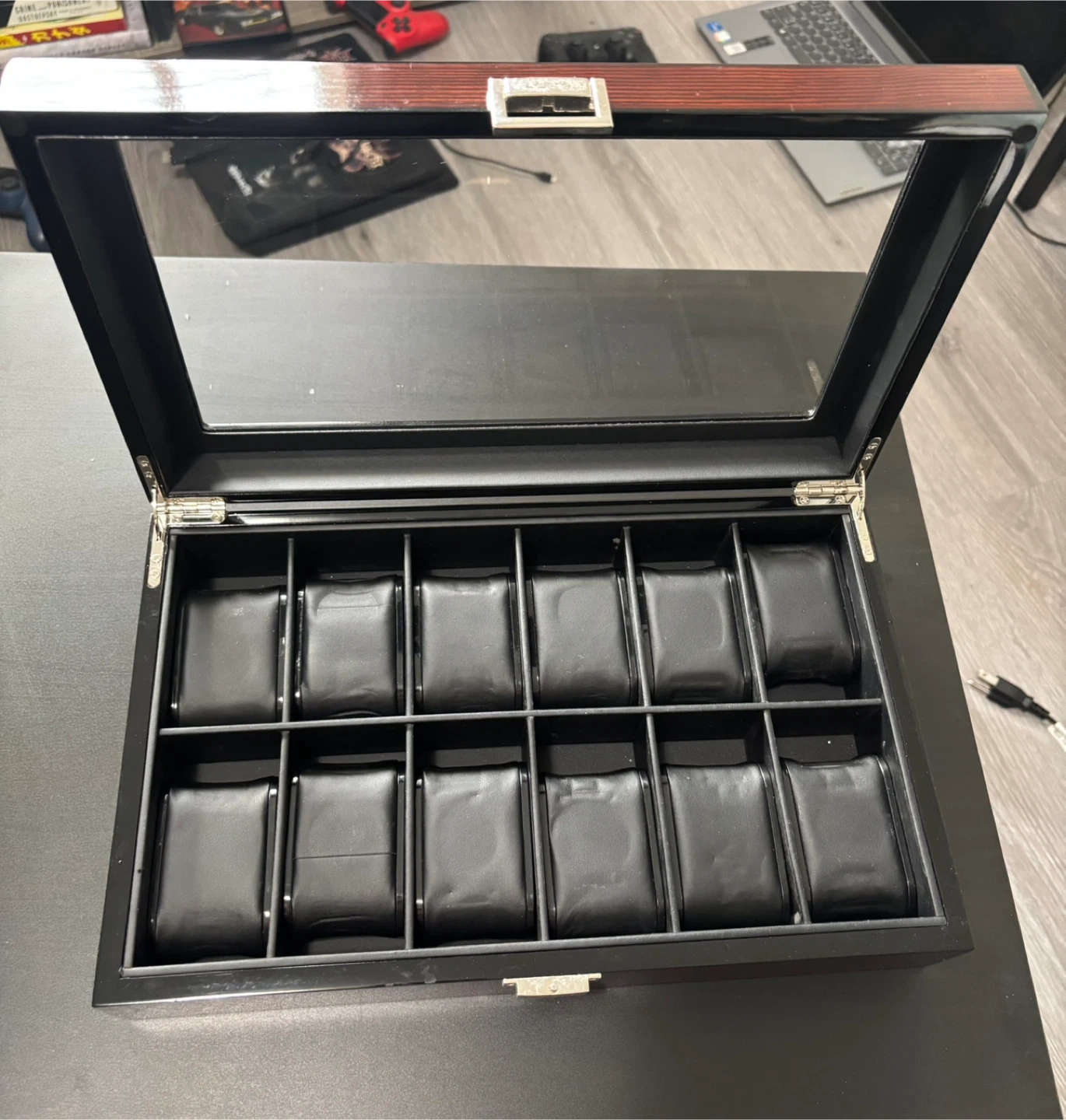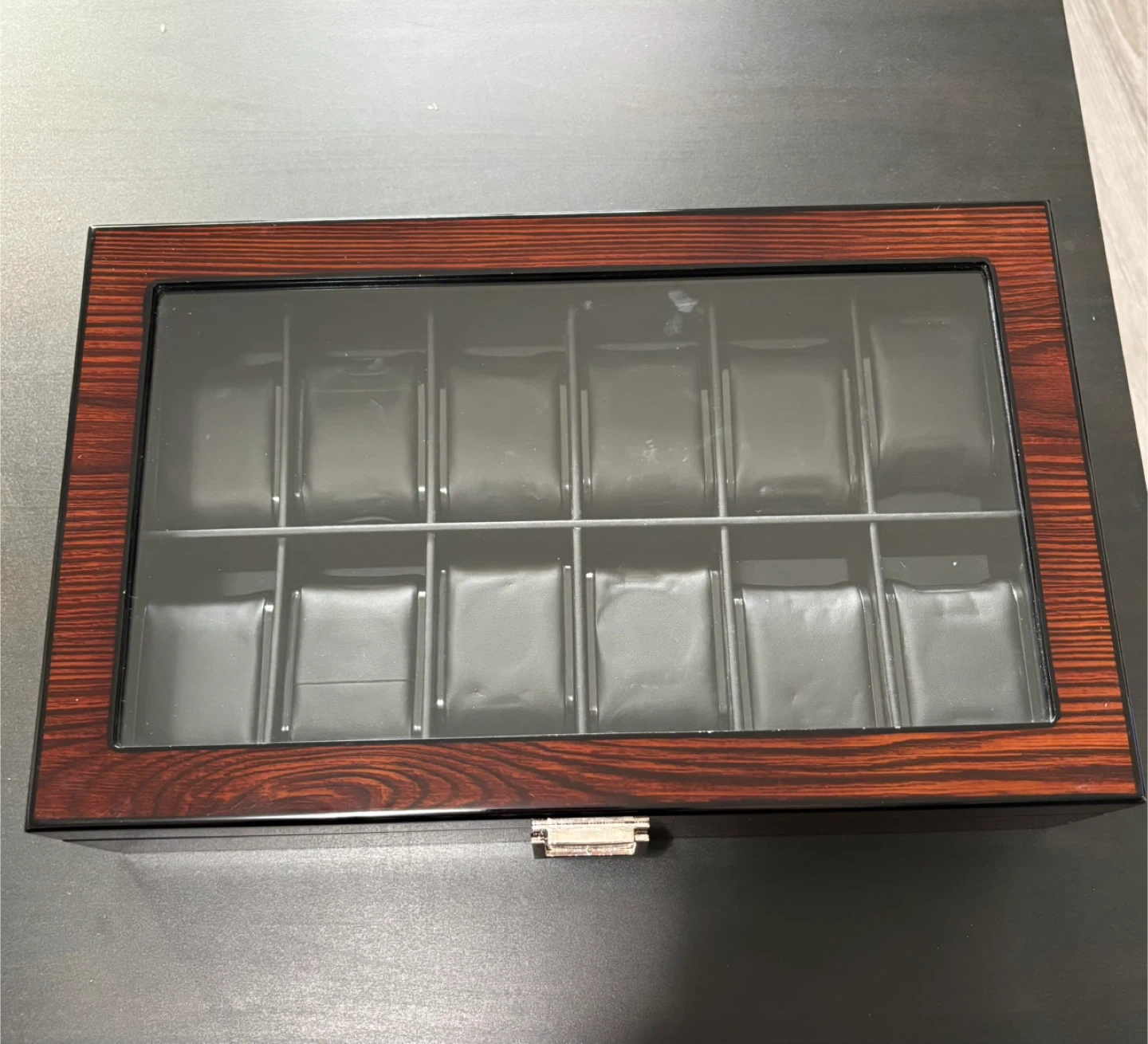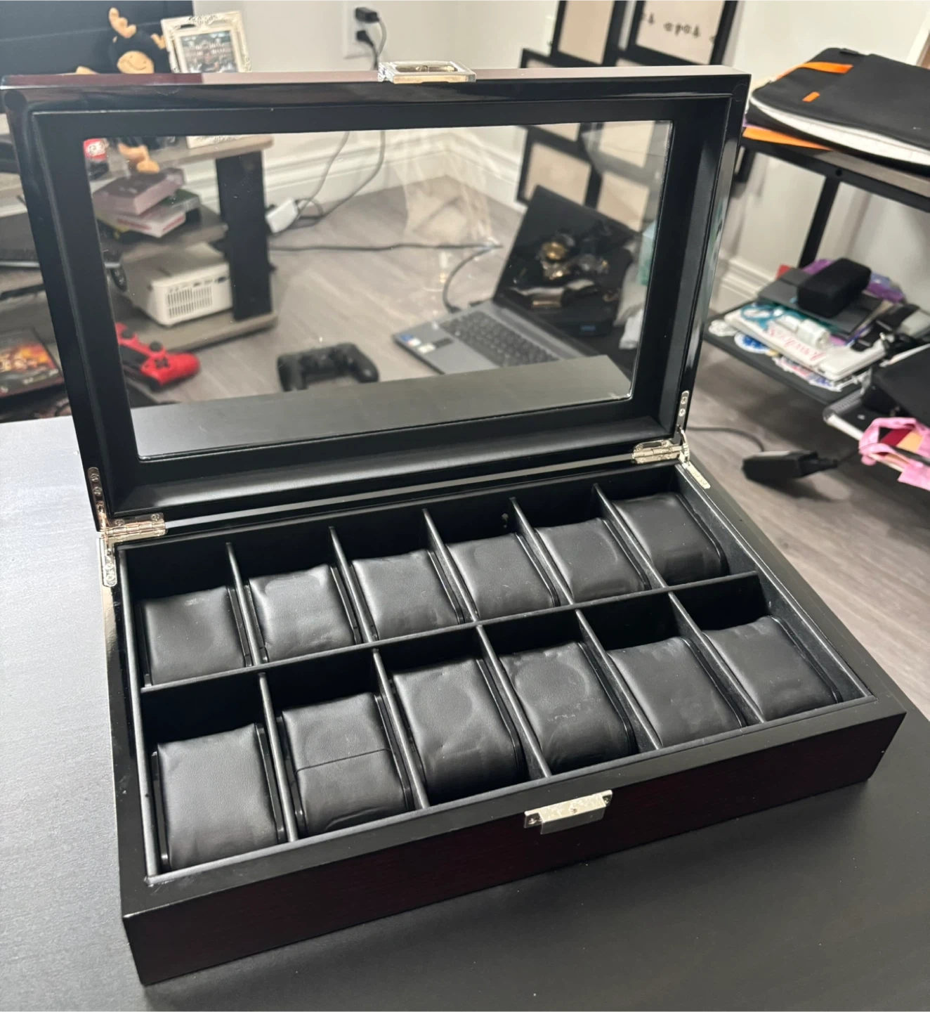 Selling a wooden watch display case, perfect for storing and showcasing your collection! It has slots for 12 watches and a glass top for easy viewing