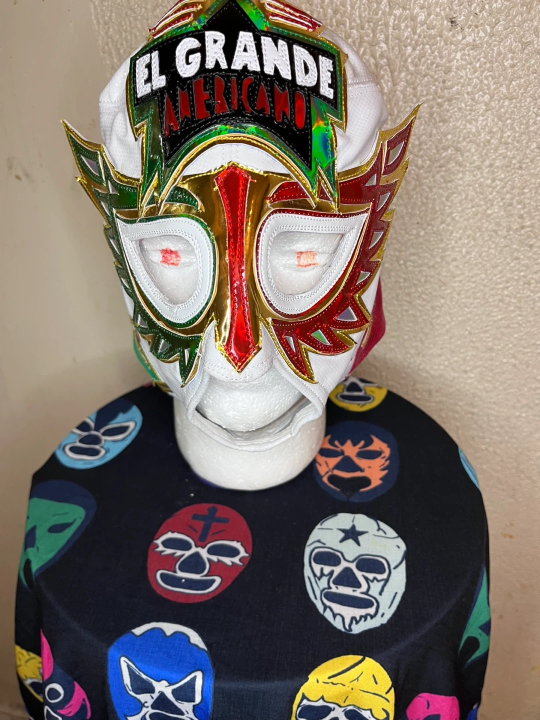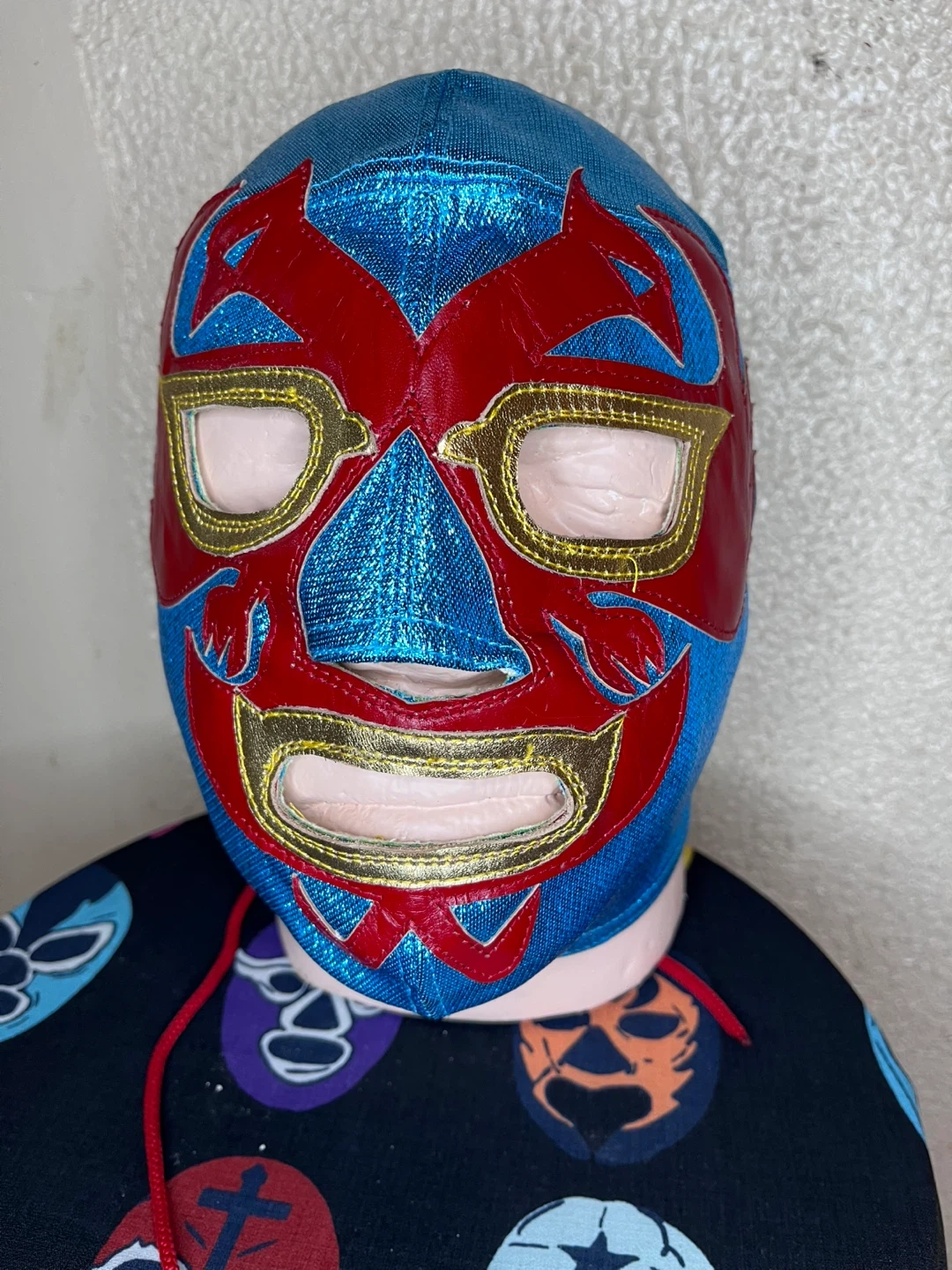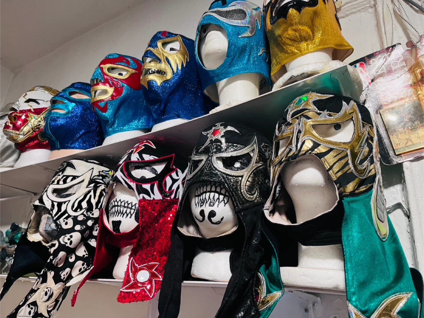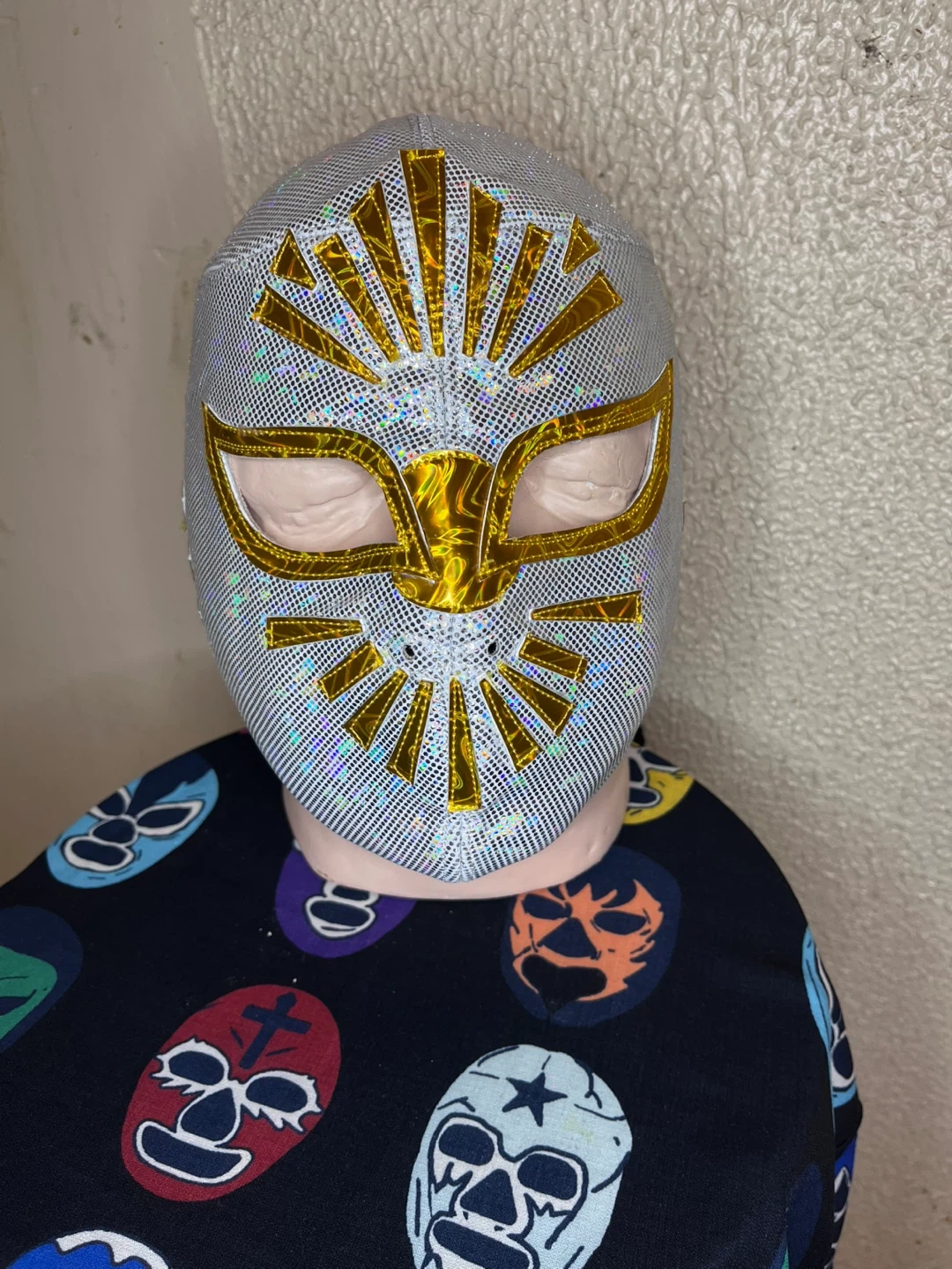 Assortment of Lucha Libre wrestling masks. Colorful designs include characters with gold accents, animal themes, and skull motifs. Fabric construction.