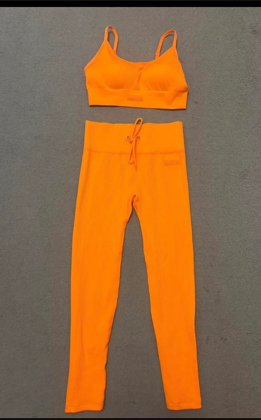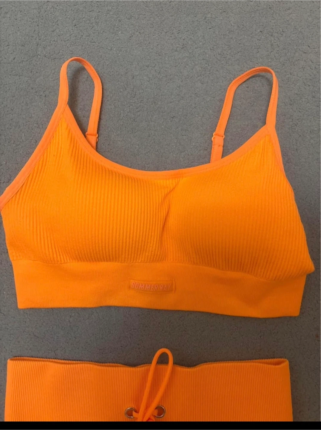 This vibrant orange ribbed set includes a sports bra and matching leggings. Both pieces feature the Sommer Ray branding. It's made from a stretchy, comfortable fabric perfect for workouts or casual wear. Fits size small.
