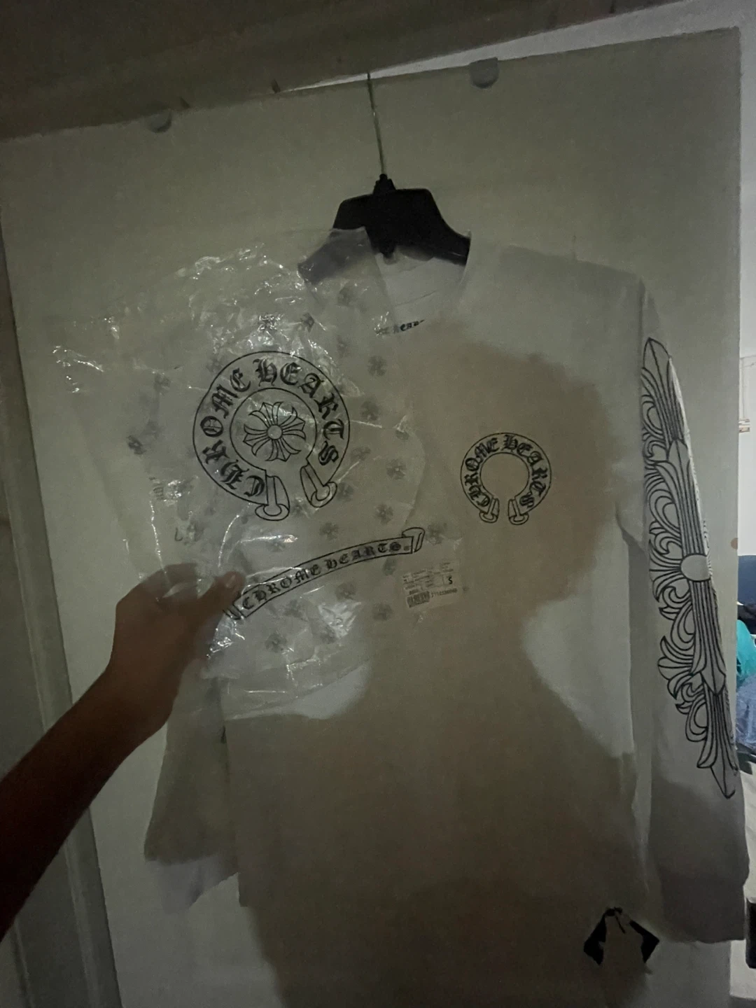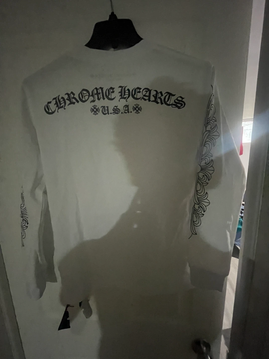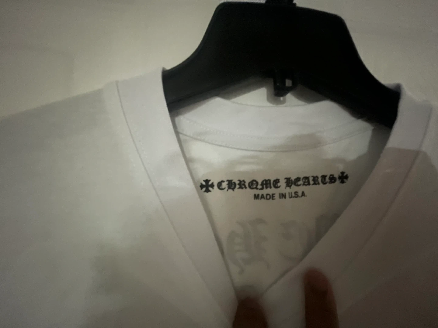 White long sleeve t-shirt with Chrome Hearts logo on the chest and sleeves. Made in the USA. Includes original tags and packaging.