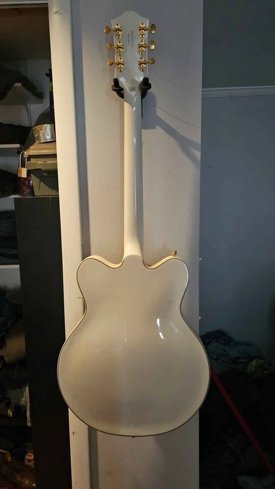 Stunning Gretsch G5422TG electric guitar. This is a beautiful white hollow body with gold hardware and a Bigsby tremolo. It has a classic look and sounds great. Comes with its hard case.
