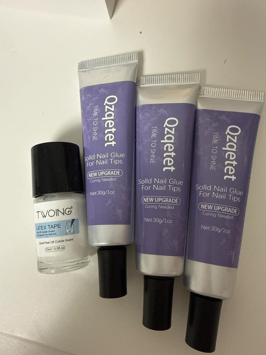 Three tubes of Qzqetet Solid Nail Glue for Nail Tips, each 30g/1oz. Includes one TWOING Latex Tape Liquid Peel Off Cuticle Guard, 15ml/0.5fl.oz. Great for nail art applications!