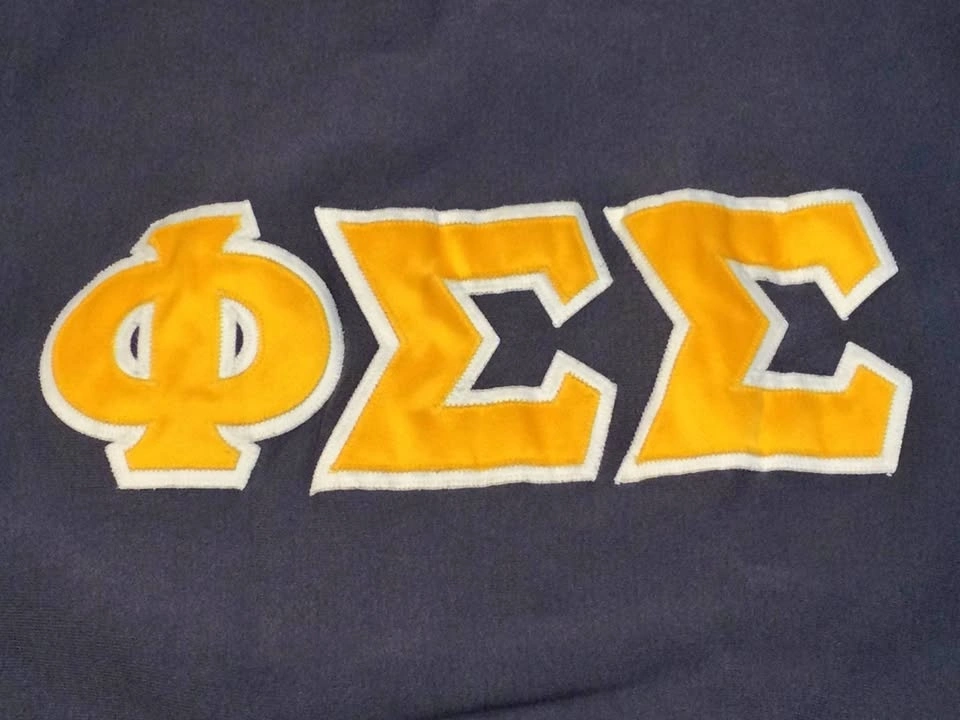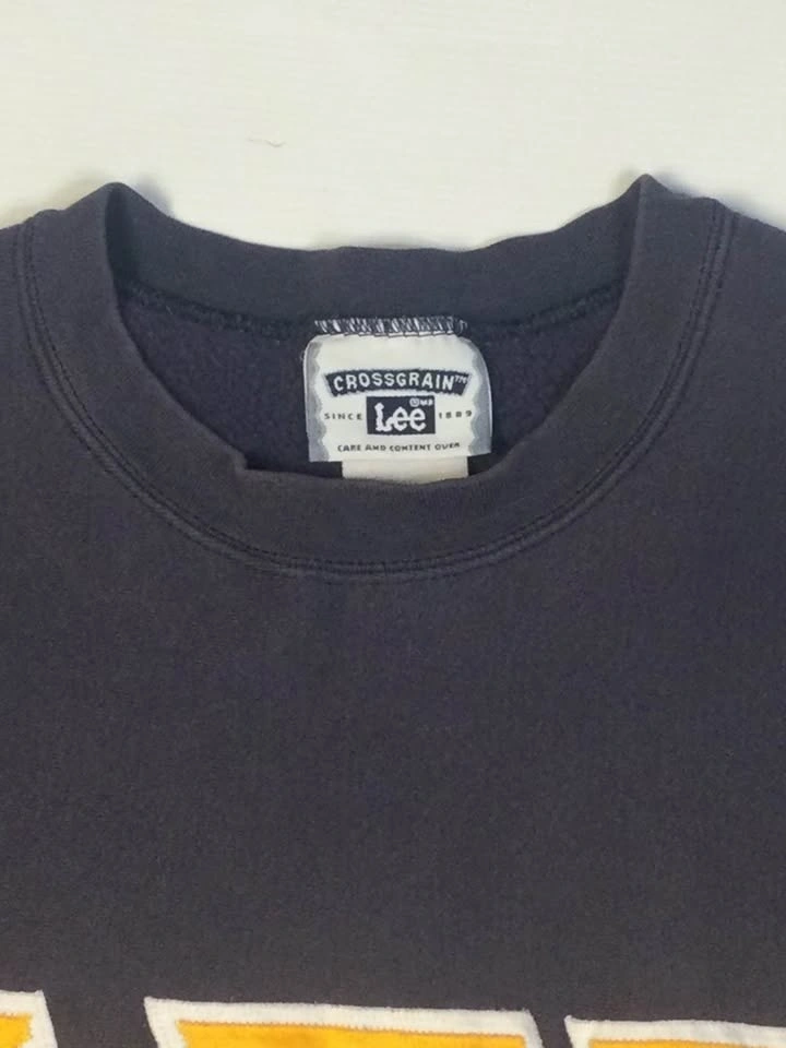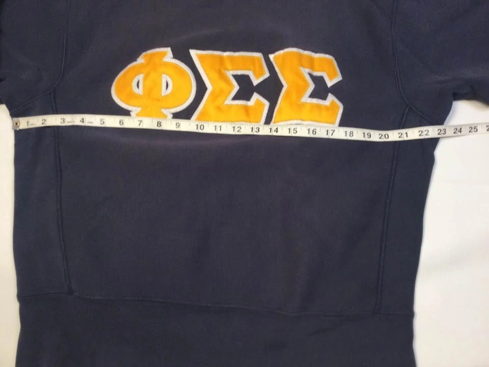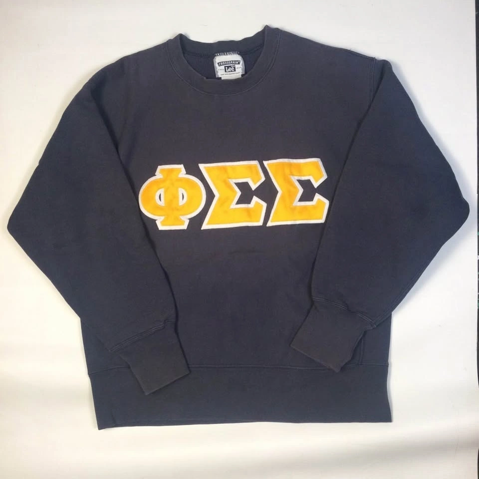 Vintage Lee Phi Sigma Sigma sweatshirt. Dark gray/navy color with yellow and white Greek letters. Size M. The sweatshirt is in vintage condition, there is some color change, as well as fraying on the edges of the sleeves. Cash only, public meetup in Manhattan / Hell's Kitchen.