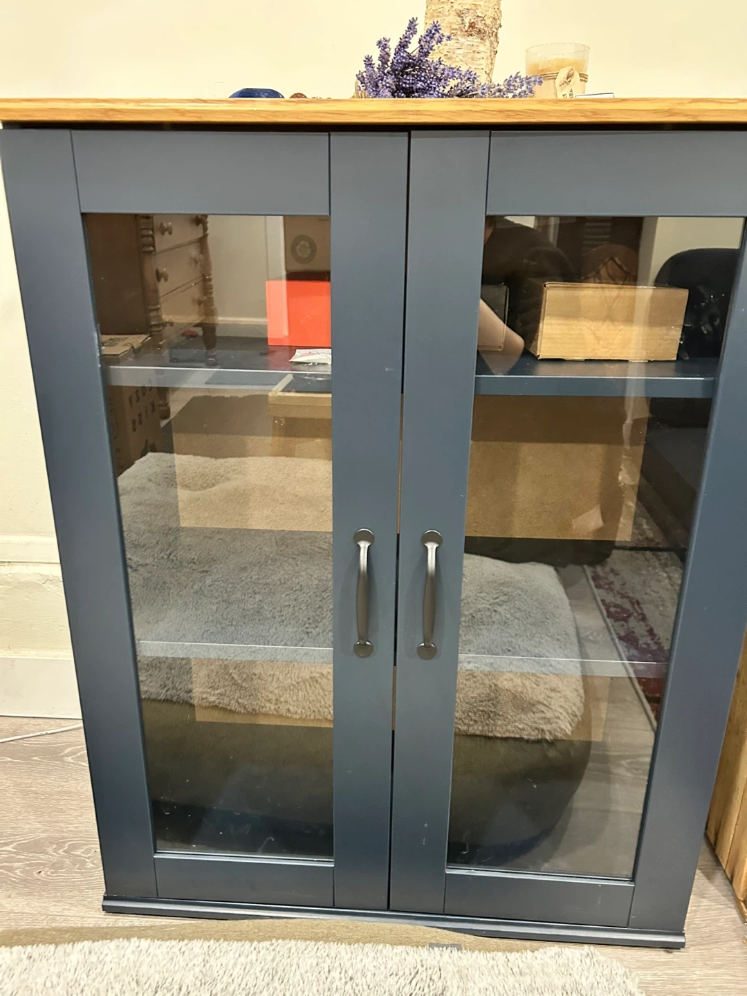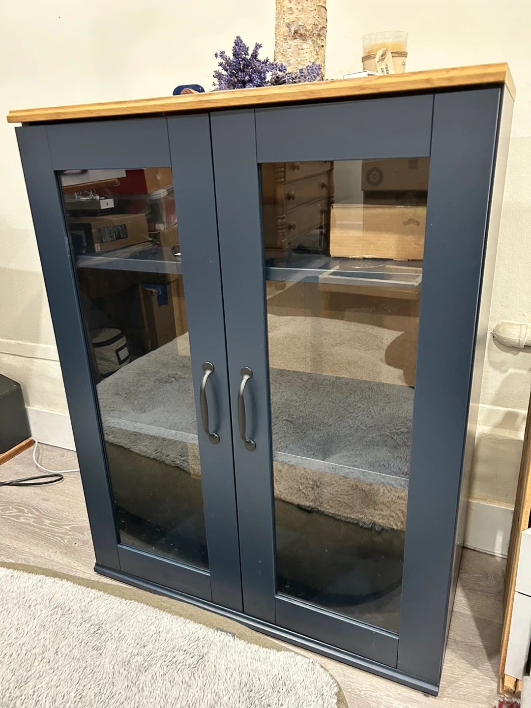 This display cabinet features a dark blue finish with a light wood top and glass doors. It's got adjustable shelves inside for storage or display. The cabinet has a clean, modern look that's great for showcasing items.