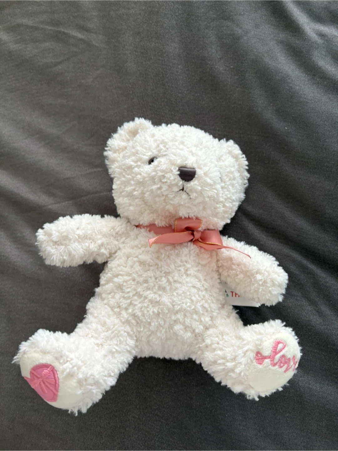 This is a soft, white teddy bear from Thinka. It has a pink ribbon around its neck and 'love' embroidered on its paw. It's a sweet plush toy.