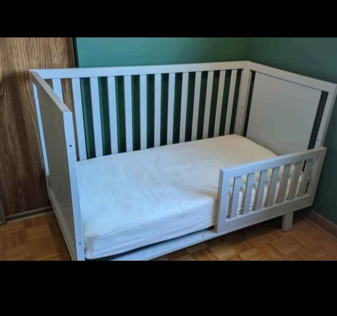 Selling a convertible baby crib in a neutral grey color. The crib is in great condition, clean, and well maintained. It easily converts into a toddler bed, making it a practical and long lasting piece as your child grows. Suitable for both boys and girls and fits well with any nursery decor.