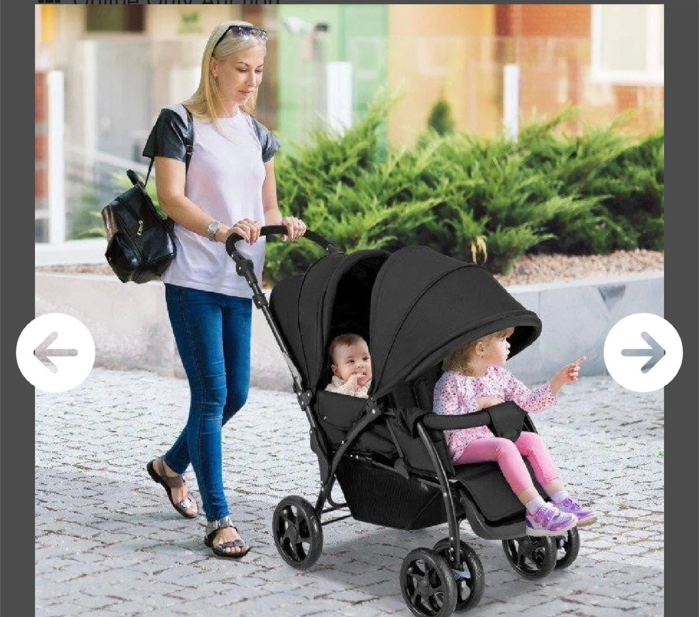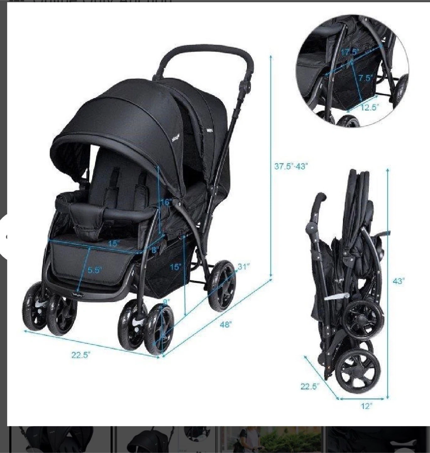 This black BabyJoy double stroller is designed for two children. It folds for easy storage and transport. Overall dimensions are 48" long by 22.5" wide, with a height adjustable from 37.5" to 43". Folded dimensions are 43" tall by 22.5" wide by 12" deep. It's great for families with twins or close-in-age siblings!