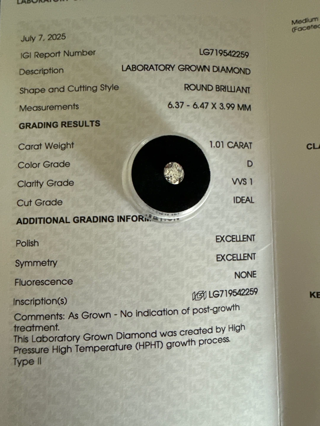 Laboratory-grown diamond, 1.01 carat weight. Round brilliant cut with D color grade and VVS1 clarity. Measurements are 6.37-6.47 x 3.99 MM. Includes IGI certificate.