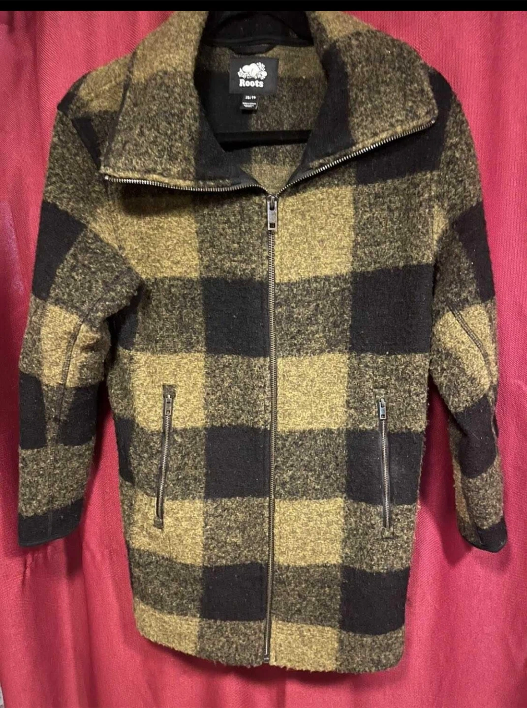 Size extra small but for like a roomie small. has side pockets and zip up. Longer styled jacket above knee